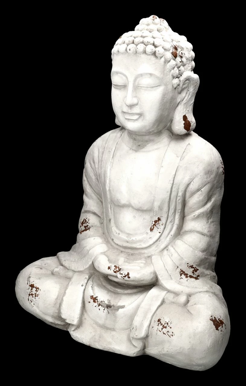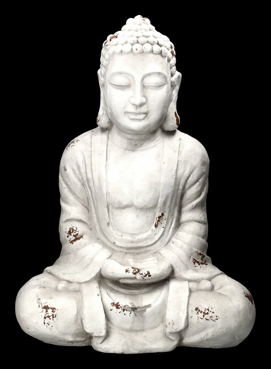Diese beeindruckende, 58 cm hohe, 44 cm breite und 26 cm tiefe Buddha Figur wurde aus sorgsam handbemaltem Fiberstone gefertigt und wirkt trotzdem wie aus Stein gehauen. Sie ist dem berühmten weißen Buddha aus Thailand nachempfunden. Buddha wird als der ‚Erleuchtete‘ und als Symbol der Weisheit und des Erwachens mittlerweile nicht nur in den asiatischen Lädern verehrt. Ob im Wohnbereich, in einem Studio oder auch auf der Terrasse oder im Garten aufgestellt, diese schöne und edle Buddha Figur verbreitet überall ein wunderbar meditatives und asiatisches Flair. Geben Sie der weißen Buddha Figur einen schönen Platz, damit sie sofort gesehen und bewundert werden kann. Die Figur eines Buddhas sollte übrigens immer so aufgestellt werden, dass der Buddha nach Osten blicken kann. Damit Sie lange Freude an dieser herrlichen Buddha-Figur haben, achten Sie aber bitte darauf, sie vor Frost zu schützen und in diesem Fall nach drinnen zu stellen.