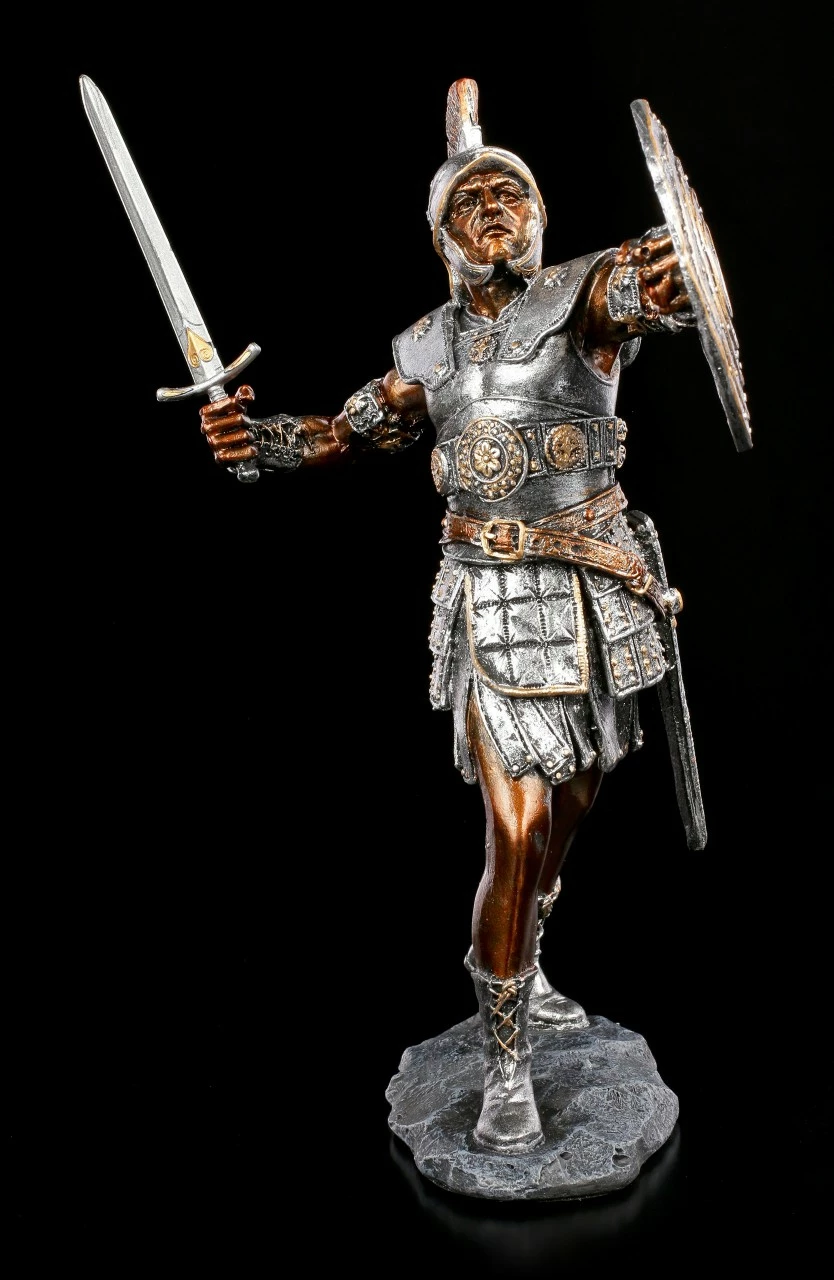 Holen Sie sich die aufregende Atmosphäre eines altrömischen Gladiatorkampfes nach Hause. Der tapfere Gladiator hebt zur Abwehr sein Schild, aber gleich geht er wieder zum Angriff über.