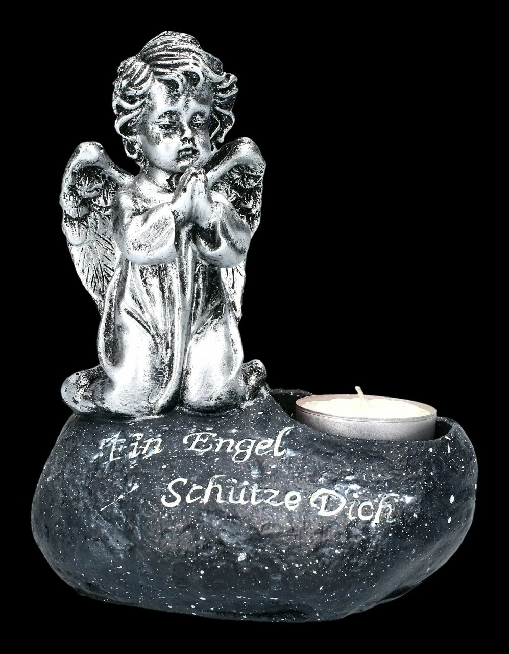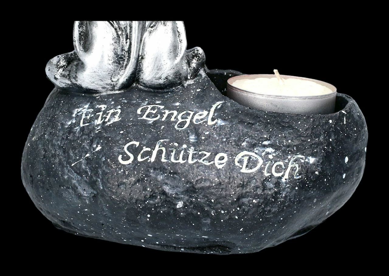 Ein niedlicher, barock aussehender kleiner Engel kniet betend auf einem wie aus einem Granitblock gearbeitetem Stein mit der Inschrift ‚Ein Engel Schütze Dich‘. Neben dem Engel ist eine Öffnung für ein Teelicht angebracht. Der Grabengel ist aus liebevoll handbemaltem Kunststein (Polyresin) gefertigt und hat eine Höhe von 15,5 cm, eine Breite von 12,5 cm und eine Tiefe von 9,5 cm. Die Lieferung erfolgt ohne Teelicht.