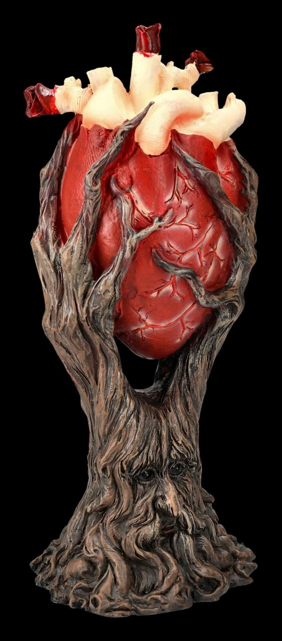 Auch wenn der Gesichtsausdruck dieses wie aus einer uralten Wurzel blickenden Greenman eher ernst wirkt, zeigt er er doch, dass er als als einer der Vegetationsgötter das pulsierende Leben in den Händen hält. Denn mit seinen nach oben gestreckten Händen hält er fest ein blutrotes Herz umschlungen. Schließlich ist der Greenman ein Symbol für Sterben und Wiedergeburt, aber er schützt auch das Entstehen und Vergehen der gesamten Natur. Mit der Höhe von 33,5 cm, der Breite von 14 cm und der Tiefe von 12 cm ist die sorgfältig und detailreich aus handbemaltem Kunststein (Polyresin) gefertigte Greenman Figur mit dem roten Herzen eine sehr faszinierende Deko und auch ein tolles Geschenk.