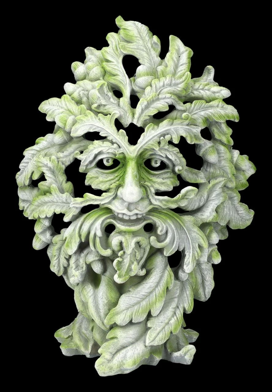 Dieser mystische Baumgeist von Andrew Bill wirkt wie eine bereits mit Grünalgen überzogene uralte Darstellung eines Greenman. Beinahe so findet man sie auf manchen Kirchen, die den Naturgeist aus heidnischen Zeiten als Schmuck übernommen hatten. Der Bildhauer und Künstler Andrew Bill aus Staffordshire liebt die Kunst der Fantasie und das ist auch bei seiner Greenman-Skulptur ‚Forest Ancient‘ zu sehen. Erst auf den zweiten Blick entdeckt man zwischen den Blätttern die klugen Augen und den Mund des Baumgeistes. Die 29 cm hohe, 21,5 cm breite und 13 cm tiefe Skulptur mit den vielen Details wurde aus hochwertigem Kunststein (Polyresin) gefertigt und von Hand bemalt. Diese Beumgeist-Statue von Andrew Bill wird in jedem Ambiente zum sofortigen Blickfang.