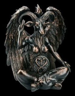 Wahrlich beeindruckend ist diese kupferfarben handbemalte Baphomet-Figur aus hochwertigem Kunststein (Polyresin). Der französische Diakon, Schriftsteller und Okkultist Alphonse Louis Constant – besser bekannt unter seinem Künstlernamen Éliphas Lévi Zahed – gilt seit seinem Werk zur Dunklen Magie als Wegbereiter des modernen Okkultismus. Darin beschrieb er Baphomet als Symbol des Gleichgewichts der Gegensätze: Also halb Mensch, halb Tier – halb männlich, halb weiblich – halb gut, halb böse – halb Engel, halb Satan etc. Baphomet war die Gottheit, die angeblich von den Templern angebetet wurde, was als Hauptgrund für die Inquisition der Tempelritter angeführt wurde. Später wurde Baphomet in die okkulten und mystischen Rituale aufgenommen. Den rechten Arm mit dem lateinischen Wort ‚Solve‘, also ‚Auflösen‘, hält diese wunderbare Darstellung der ‚Sabbatical Goat‘ mit dem magischen Segen nach oben und den linken Arm mit der Aufschrift ‚Coagula‘ einladend nach unten. Die detailreiche, 40 cm hohe 32 cm breite und 22 cm tiefe Baphomet-Figur wird mit Sicherheit jeden faszinieren.