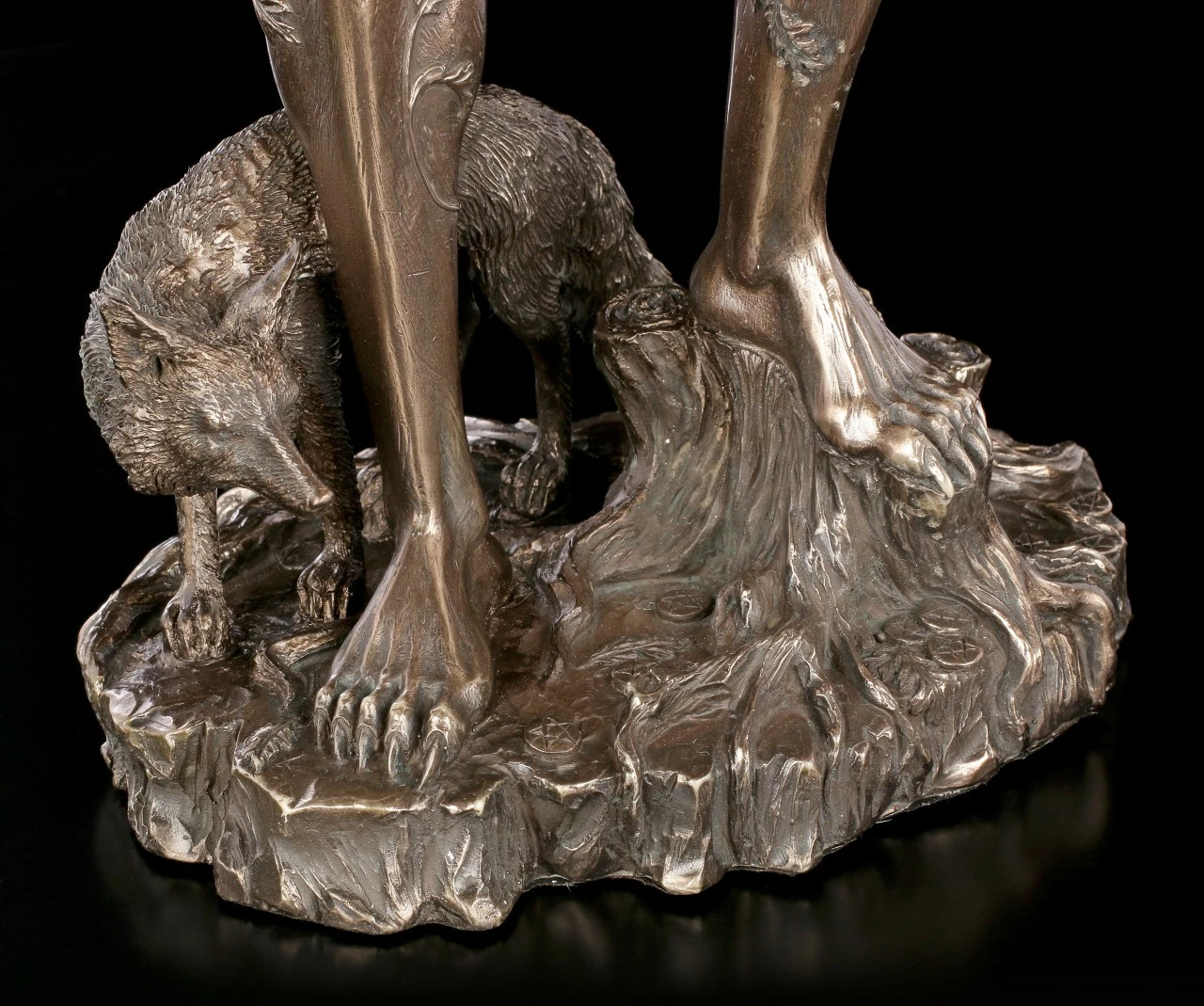 Der gehörnte keltische Gott Cernunnos gilt als Gott der Fruchtbarkeit, der Natur und der Tiere. Stolz trägt er ein Hirschgeweih. Seine Widderhornschlange trägt er auf seinem linken Arm und er wird von einem Wolf begleitet. Er galt neben der Erdmutter als zentrale Gottheit und vermittelte zwischen Diesseits Schlange und Jenseits(dem Wolf). Der von gehörnte Cernunnos von Maxine Miller wurde mit außergewöhnlicher Liebe zum Detail designt und ausgearbeitet. Dadurch wird die Figur der Blickpunkt auf einem Tisch oder einem Regal.