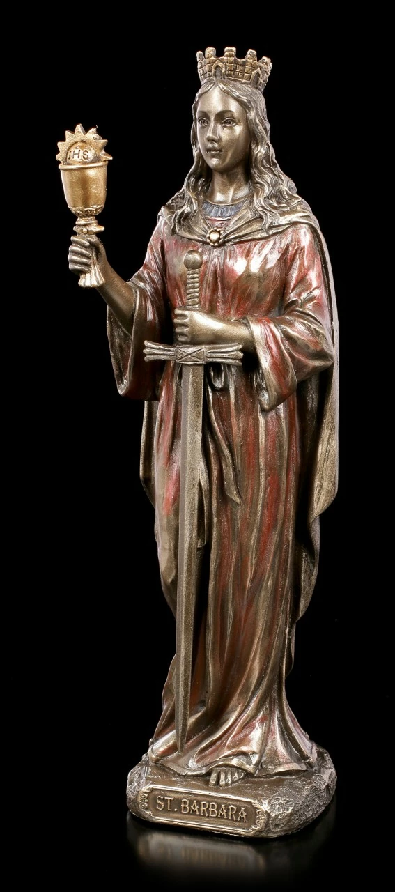 Barbara von Nikomedien lies sich als Christin taufen und starb laut einer Legende durch die Hand ihres Vaters als Märtyrerin. Ihr Vater wurde daraufhin von einem Blitz erschlagen. Bei Gewitter werden daher die Gebete an die Heilige Barabra gerichtet – aus dem selben Grund ist sie auch die Schutzheilige der Artillerie. Als eine der 14 Nothelfer wird sie zum Schutz vor dem jähen Tod angerufen sowie als Beistand der Sterbenden. Die heilige Barbara zählt in Deutschland zu den Drei Heiligen Madl´n. Diese wundervolle bronzierte und colorierte Kunststein Figur von Veronese ist aus der Serie The Holy Journey.