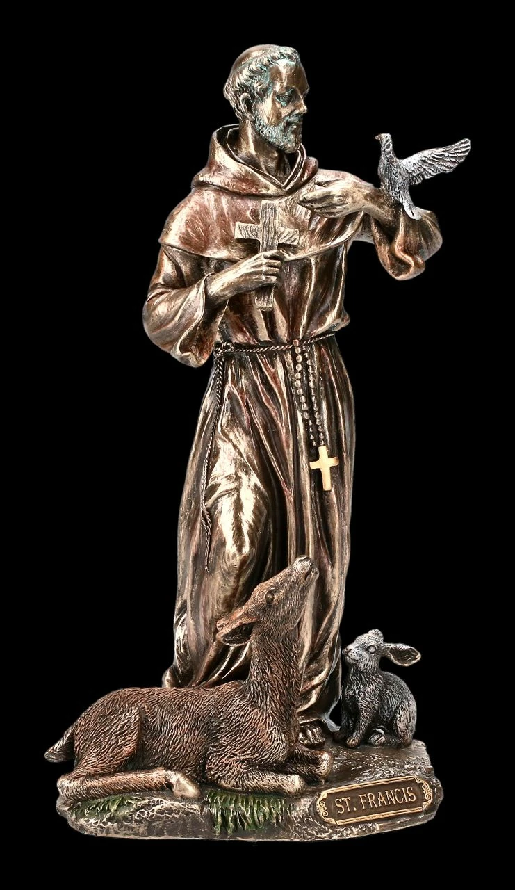 Mit liebevollem Blick schaut er auf die Taube, die zutraulich auf seinem linken Arm gelandet ist und zu seinen Füßen sitzen ein Hase und ein Reh, die vertrauensvoll zu ihm aufschauen – Franziskus von Assisi. Mit dieser edel bronzierten und colorierten Heiligen Figur aus der Studio Collection hat Veronese wunderbar dargestellt, dass Franz von Assisi der Patron der Tiere und des Naturschutzes ist. Mit der Höhe von 21,5 cm, der Breite von 11,5 cm und der Tiefe von 8,5 cm ist die sorgfältig aus Kunststein (Polyresin) gefertigte Figur des Heiligen Franziskus ein stilvoller Blickfang und das perfekte Geschenk für jeden, der den Heiligen Franziskus wegen seiner Liebe zur Natur und zu den Tieren verehrt.