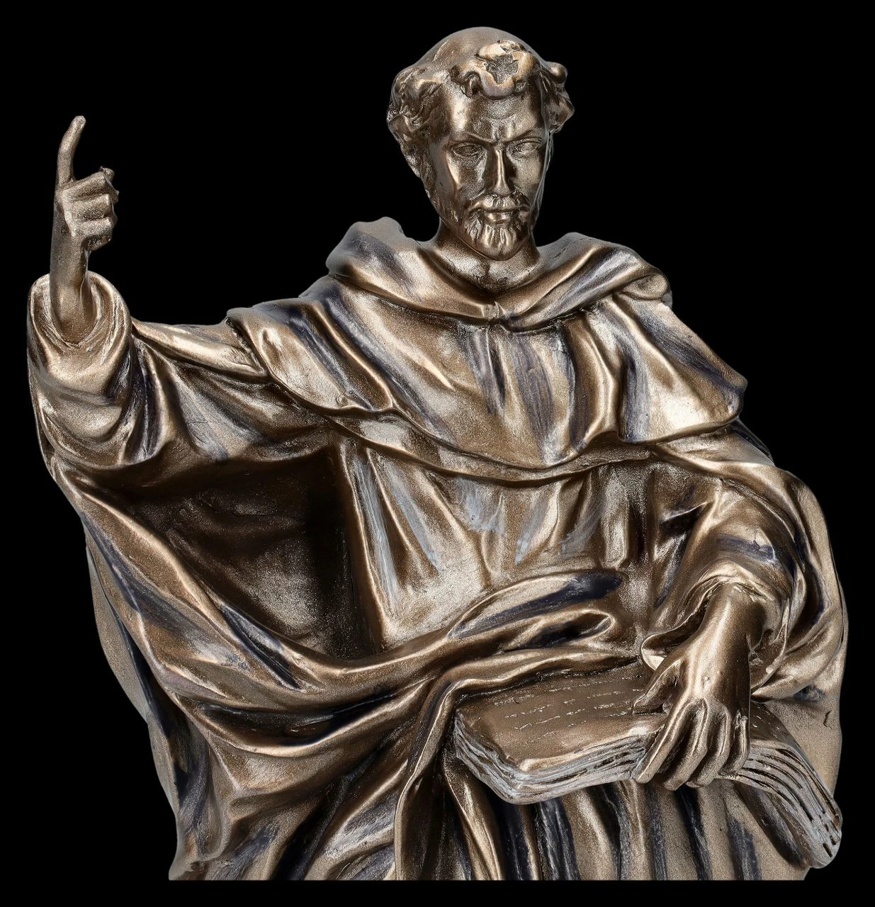 Die edle Figur des Heiligen Domenikus mit seinem Hund stammt aus der Summit Collection von Veronese. Der in Spanien geborene Priester stammte aus einer deutsch-kastilischen Gutsbesitzerfamilie und war der Stifter des Dominikanerorden. Er war überzeugt von der Güte und Liebe Gottes und versuchte in seinem Leben stets, gewaltfrei und ohne Vorurteile auf jeden zuzugehen. Sein Gedenktag ist der 8. August. Aus den Überlieferungen ist zu entnehmen, dass seine gläubige Mutter vor seiner Geburt ein Hündchen sah, das mit einer Fackel im Maul die Welt erleuchtete. So wird in zahlreichen Darstellungen der Heilige Domenikus meist von einem Hund mit einer Fackel begleitet, wie auch bei dieser edel bronzierten Figur aus fein coloriertem Kunststein (Polyresin). Da er selbst als äußerst gebildet galt und für ihn eine gute Bildung für alle große Bedeutung hatte, wird er auch meistens mit einem Buch in der Hand abgebildet. Die 20 cm hohe, 10 cm breite und 8,5 cm tiefe Heiligenfigur des Domenikus ist also nicht nur für Gläubige, sondern auch für jeden, der Wert auf eine gute Bildung und Ausbildung legt, ein perfektes Geschenk.