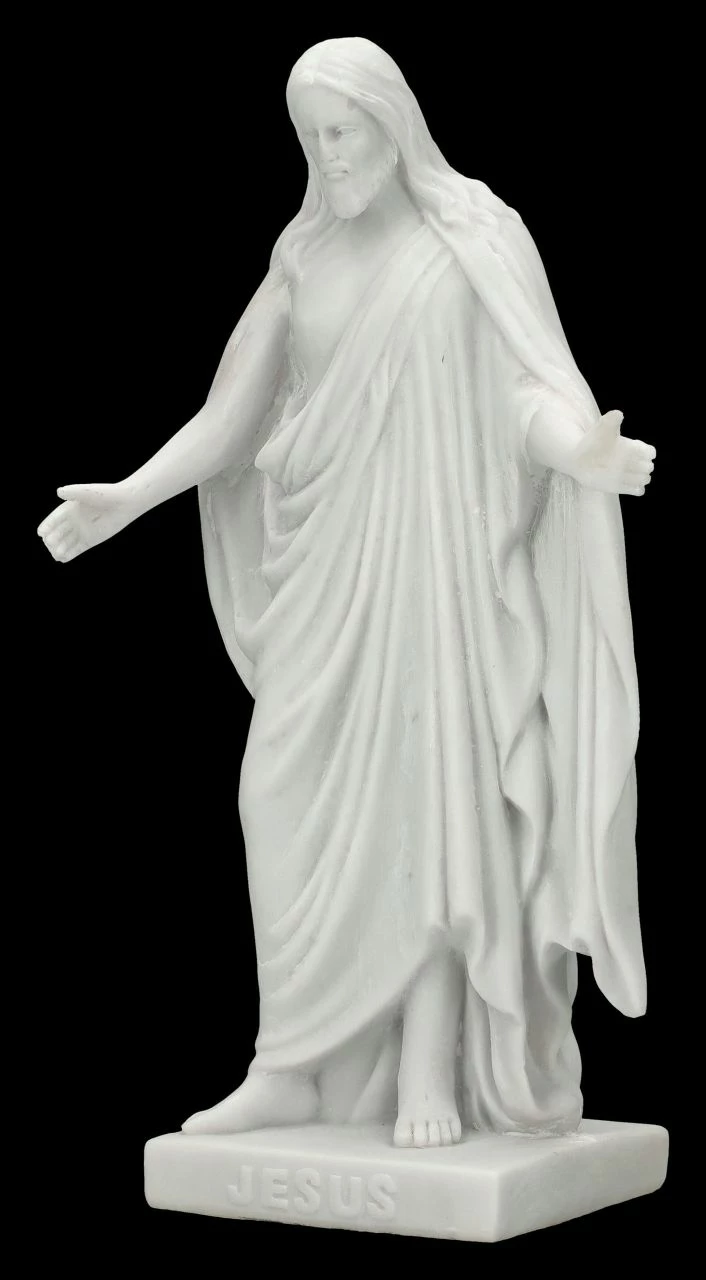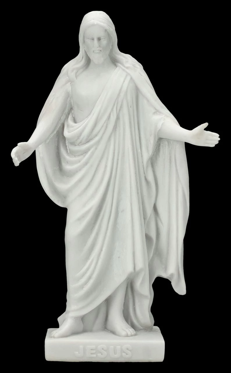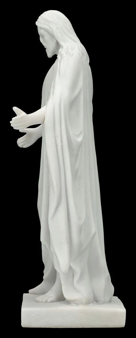 Wie aus weißem Marmor gemeißelt wirkt diese schlichte, aber damit auch sehr schöne Heiligenfigur. Mit ausgebreiteten Armen steht die 20,5 cm hohe, 11,5 cm breite und 10,5 cm tiefe Jesus Christus Figur aus Kunststein (Polyresin) auf einem mit seinem Namen bezeichneten Podest. Sie wird gerade durch die Schlichtheit zum Blickfang und Mittelpunkt auf einem privaten Altar und ist daher auch ein ganz besonderes Geschenk.