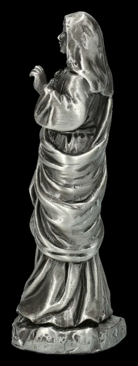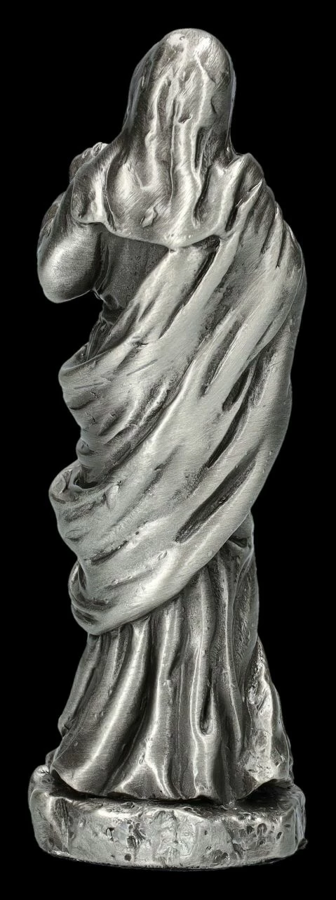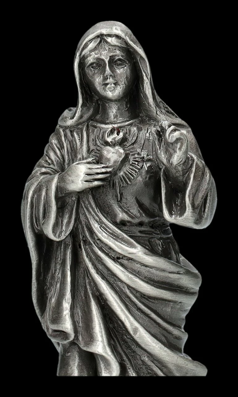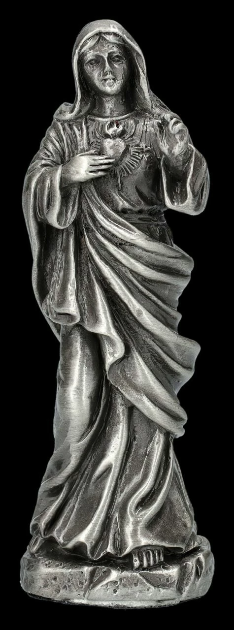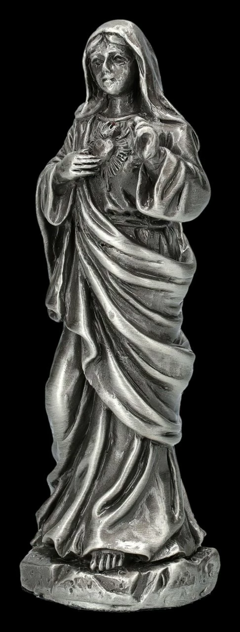 Sanft lächelnd, die rechte Hand zum Herzen weisend und die linke Hand segnend erhoben, ist diese handbemalte Heiligen Figur, die Maria mit dem sichtbaren Herzen zeigt, sorgfältig aus Zinn gefertigt. Die schöne Heiligen-Figur, die beinahe wie eine Figur aus dem Mittelalter wirkt, ist 10,5 cm hoch, 3,5 cm breit und 3,5 cm tief. Das ‚Unbefleckte Herz Mariä‘ wird in der katholischen Kirche nach Pfingsten, nach dem Fest ‚Heiligstes Herz Jesu‘, gefeiert und gehört heute zur römisch-katholischen Spiritualität. Als Zeichen der Hoffnung und Liebe ist diese schöne Zinn-Figur ‚Unbeflecktes Herz Mariä‘ auch ein wunderbares Geschenk.
