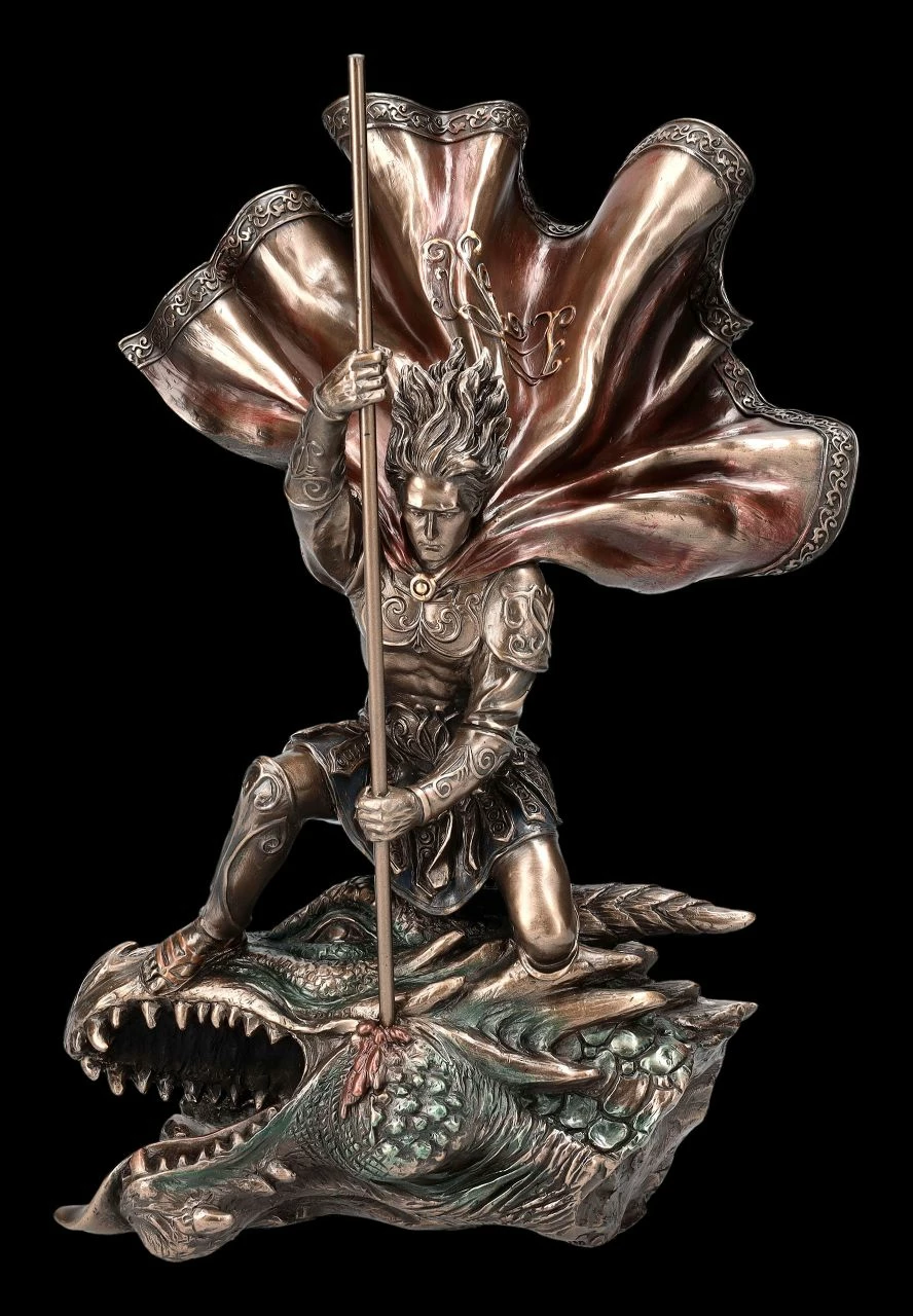 Die Skulptur des Heiligen Georg auf dem Drachenkopf stammt aus der Studio Collection von Veronese und wurde aus edel bronziertem und zurückhaltend colorierten Kunststein (Polyresin) gefertigt. Sie ist 28 cm hoch, 19 cm breit und 13,5 cm tief und zeigt einen edlen Ritter mit wehendem Umhang, wie er mit seiner Lanze in einen riesigen Drachenkopf sticht. Den Legenden nach stammte der heilige Georg aus Kappadokien in der heutigen Türkei. Ein feuerspeiender Drache hatte das Volk terrorisiert und um den Drachen zu besänftigen sollte eine jungfräuliche Königstochter geopfert werden. Georg soll die Königstochter vor dem Drachen gerettet und dann das Volk dazu gebracht haben, sich aus Dankbarkeit taufen zu lassen. Bei der Verfolgung der Christen durch Diokletian wurde Georg im Jahr 305 n.Chr. festgenommen, gefoltert und enthauptet. Doch der Sieg Georgs über das Ungeheuer wurde als Sieg des Guten über das Böse gedeutet. Die Kreuzritter verehrten ihn für seine edle Tapferkeit und brachten so die Geschichte um den Heiligen Georg und seinen Kampf gegen den Drachen in Umlauf. Die detailreiche Figur des Heiligen Georg mit dem Drachenkopf ist nicht nur für edle Ritter ein fantastisches Geschenk.