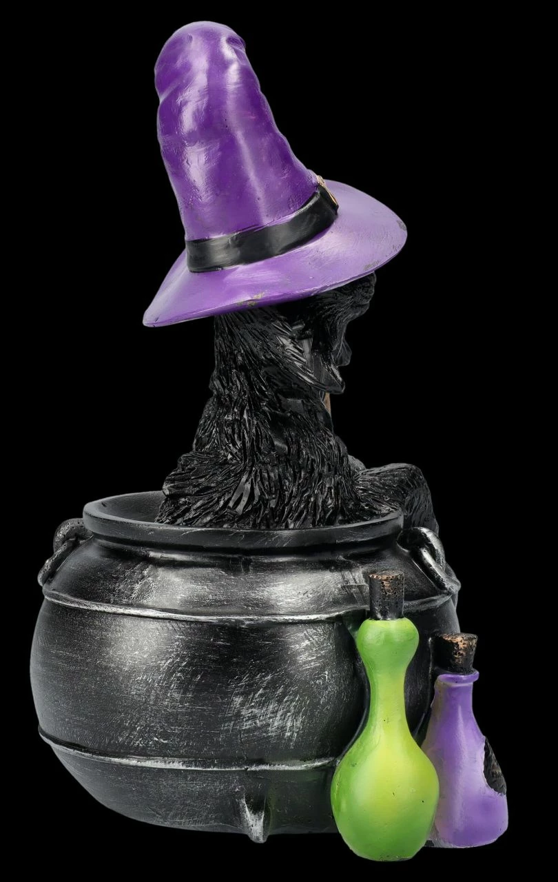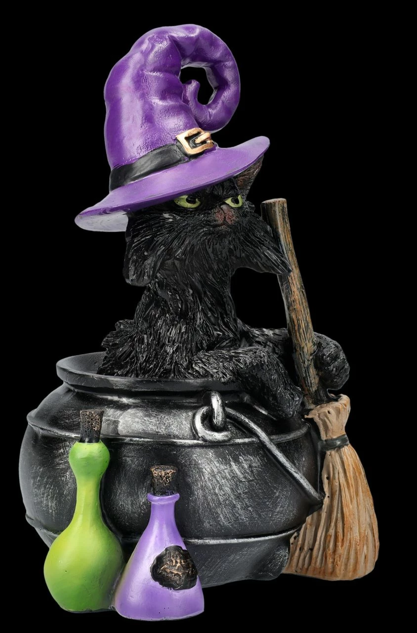 Heimliches Naschen kann schon mal schief gehen… Die kleine schwarze Hexenkatze wollte nur mal probieren, was ihre Hexe in dem Zauberkessel gebraut hat und jetzt klammert sie sich verzweifelt an den Hexenbesen, um wieder aus dem Zauberkessel herauszukommen. Wäre vielleicht nicht so geschickt, wenn ihre Hexe sie im Zauberkessel entdecken würde…. Die lustige, 17 cm hohe, 12 cm breite und 10 cm tiefe Hexenkatzen-Figur aus handbemaltem Kunststein (Polyresin) ist nicht nur für Halloween eine perfekte Deko, sie ist auch ein witziges Geschenk für jeden Hexenhaushalt, oder auch für heimliche Naschkatzen.