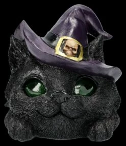 Nicht nur der Hexenhut mit dem Schädel-Emblem zeigt, wem die schwarze Katze gehört. Auch die grün leuchtenden Augen in der Dunkelheit beweisen, dass es der Kopf einer Hexenkatze ist, der hier so harmlos liegt. Die 14 cm hohe, 13 cm breite und 14 cm tiefe Figur mit dem Hexenkatzen-Kopf ist aus handbemaltem Kunststein (Polyresin). Durch die batteriebetriebene LED-Beleuchtung mit Farbwechsler wirken die Augen sehr mystisch. Für die LED-Beleuchtung werden 2 x AA Batterien benötigt, die jedoch nicht in der Lieferung enthalten sind. Familiar Grin, die Figur mit dem Hexenkatzen-Kopf, ist vor allem an Halloween eine perfekte Deko.