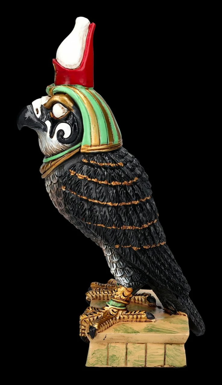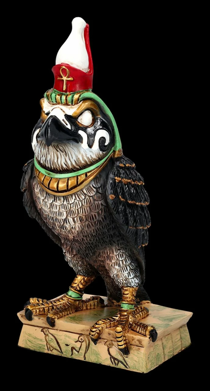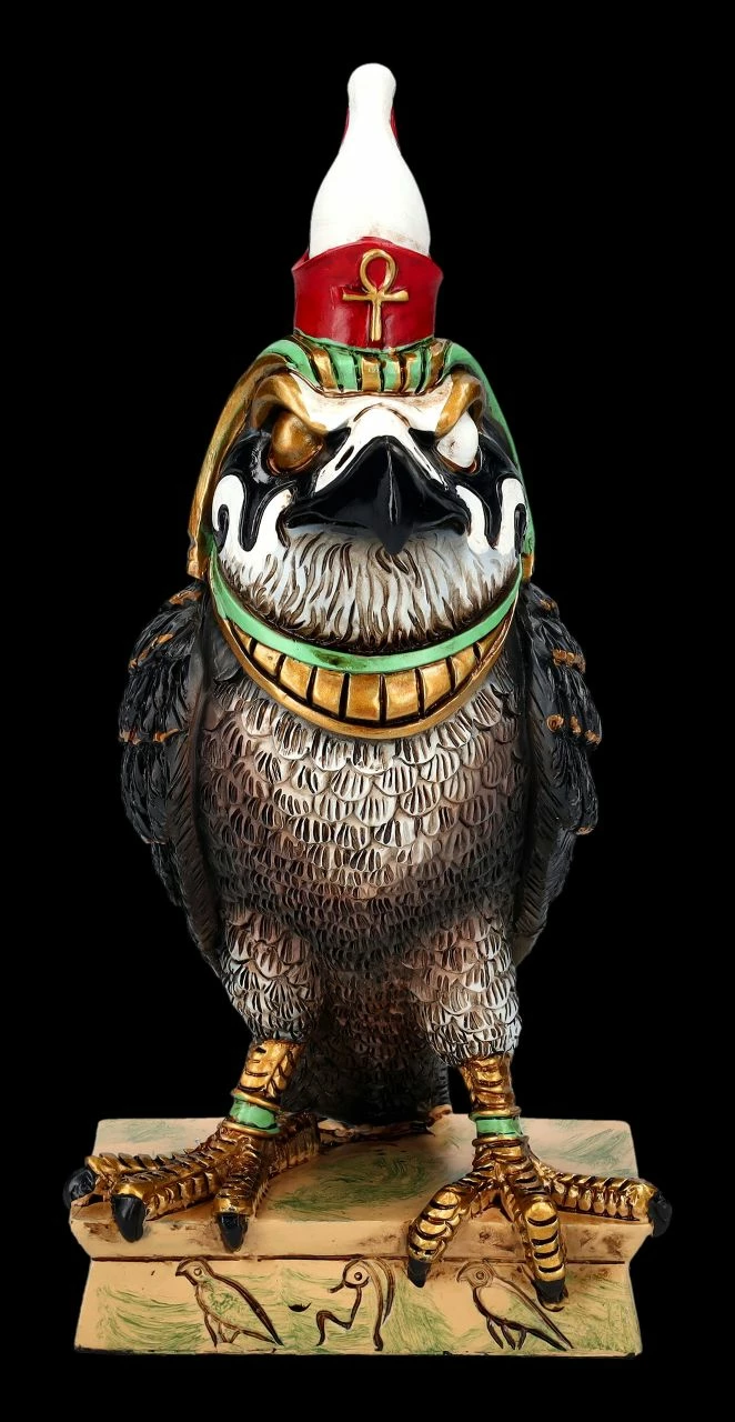 Horus, der altägyptische Gott in Falkengestalt wurde vom bekannten Fantasy-Künstler Stanley Morrison fantasiereich umgesetzt. Auf einem mit ägyptischen Hieroglyphen verzierten Podest sitzt Horus, der Himmels- oder auch Königsgott, der auch als Welten- oder Lichtgott und Beschützer der Kinder verehrt wurde, in seiner Gestalt als Falke mit der Doppelkrone von Ober- und Unterägypten auf seinem Kopf. Stanley Morrison ist nicht nur für seine Drachen in allen Positionen bei Sammlern sehr beliebt. Auch die Fantasy-Kreaturen aus der Ägypten-Serie, wie diese Horus Figur aus der altägyptischen Mythologie, gehören zu seinen fantasievoll-kreativen Arbeiten. Die 20 cm hohe, 9 cm breite und 11,5 cm tiefe Horus-Figur in Falken-Gestalt wurde detailreich aus handbemaltem Kunststein (Polyresin) geschaffen. Bei Sammlern ist der Fantasy Künstler Stanley Morrison für alle seine fantasievollen Arbeiten, die es auch in unserem Shop zu finden gibt, sehr beliebt. Jeder Fan wird begeistert sein, wenn er diese ausgefallene Figur als Geschenk bekommt.