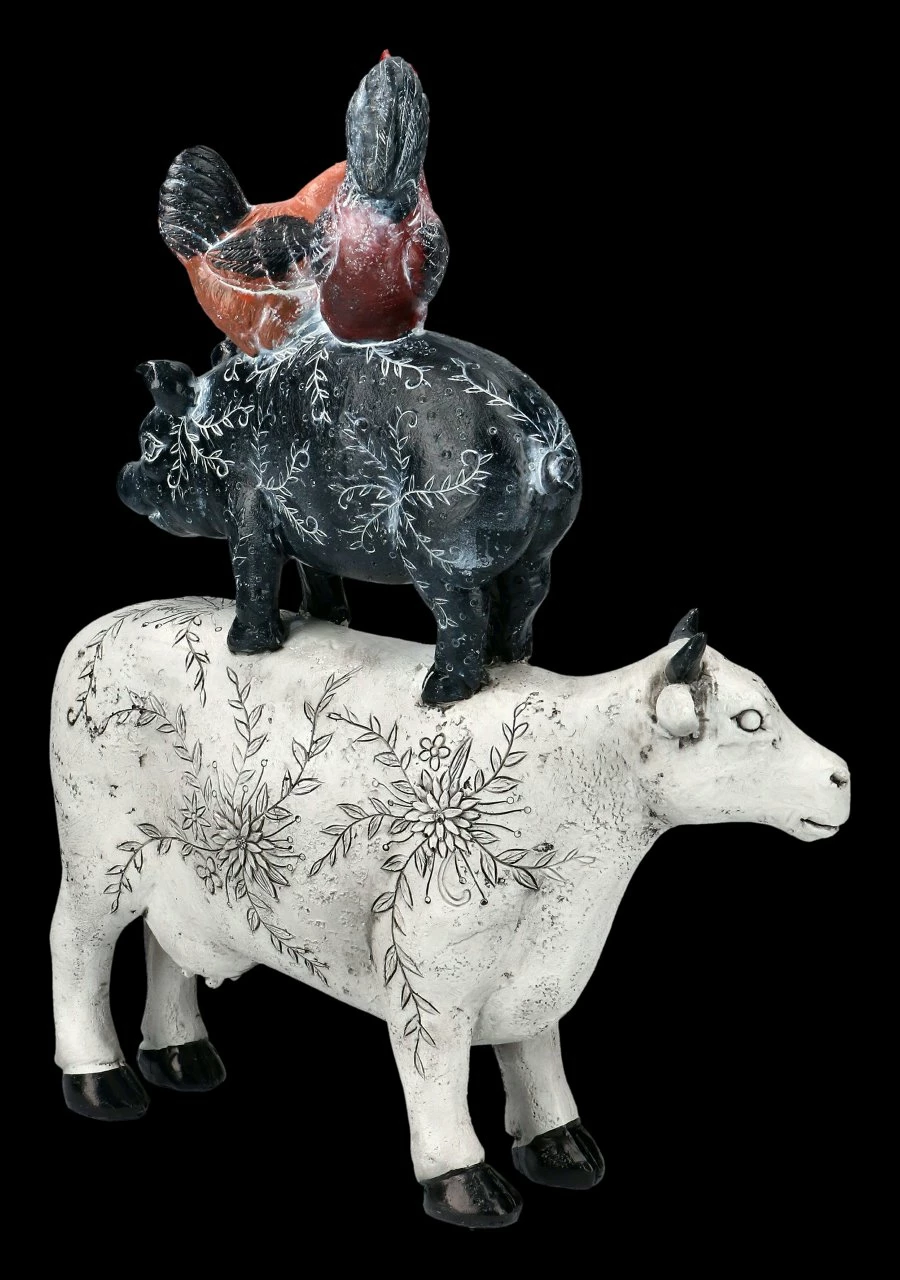 Auf diesem Bauernhof geht’s lustig zu. Mit zartem Strich ist das schwarze Schwein bemalt, das verkehrt herum auf einer weißen Kuh steht, die wiederum mit feinen Zeichnungen von Blumen verziert wurde. Auf dem Schwein hat sich auch noch ein bunter Hahn mit seinem Huhn niedergelassen. Diese faszinierende, witzige Dekofigur ist mit großer Sorgfalt handbemalt und sehr detailreich aus Kunststein (Polyresin) gefertigt. Sie hat eine Höhe von 30 cm, eine Breite von 23,5 cm und eine Tiefe von 11 cm und wird als tolle Dekoration für die Küche, aber auch in einem Lokal, oder einem Geschäft garantiert alle Blicke der Besucher auf sich ziehen.