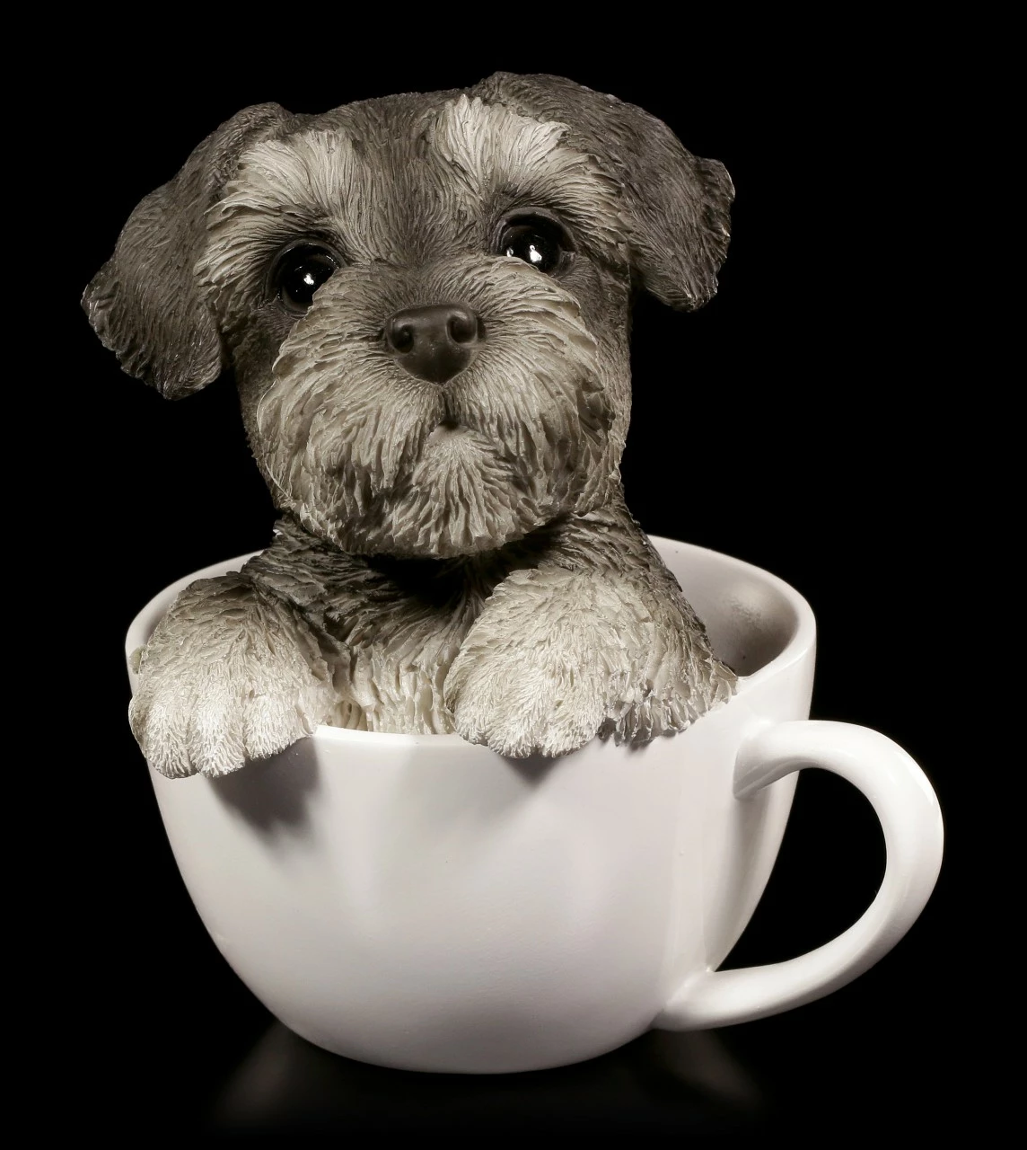 Der kleine Schnauzer Welpe möchte gerne ein neues Zuhause. Er sitzt bereits reisefertig und handlich in seiner Teetasse. Wäre er oder einer seiner Freunde nicht vielleicht ein tolles neues Mitglied Ihrer Familie?