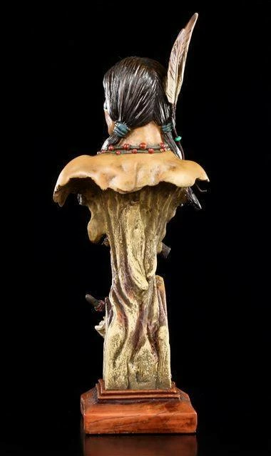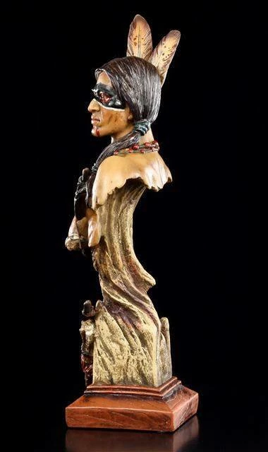 Diese Indianer Büste ist ein Muss für alle Indianer Fans. Der Indianer hat seinen Kopf stolz erhoben und blickt in die Ferne. Er hält seinen Tomahawk fest in den Händen. Beinahe kann man seine Kraft und seinen Mut spüren.