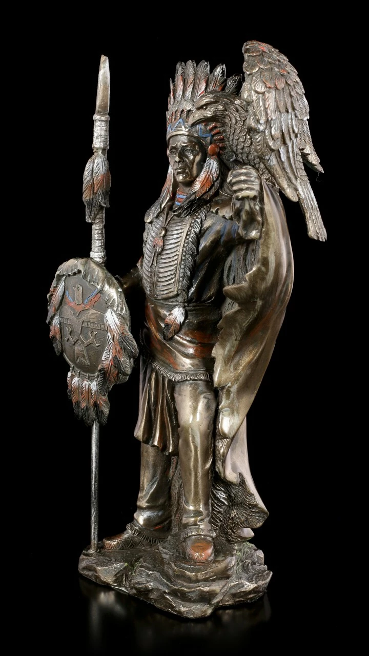 Nur der Indianer Häuptling hat die spirituelle Kraft, dem mächtigen Adler zu befehlen. Das edle Tier hat es sich auf seinem Arm bequem gemacht und die beiden ungleichen Gefährten blicken in das Tal und warten auf die geeignete Beute. Die bronzierte und colorierte Figur aus Kunststein (Polyresin) ist sehr detailgetreu gearbeitet und wird Sie begeistern.