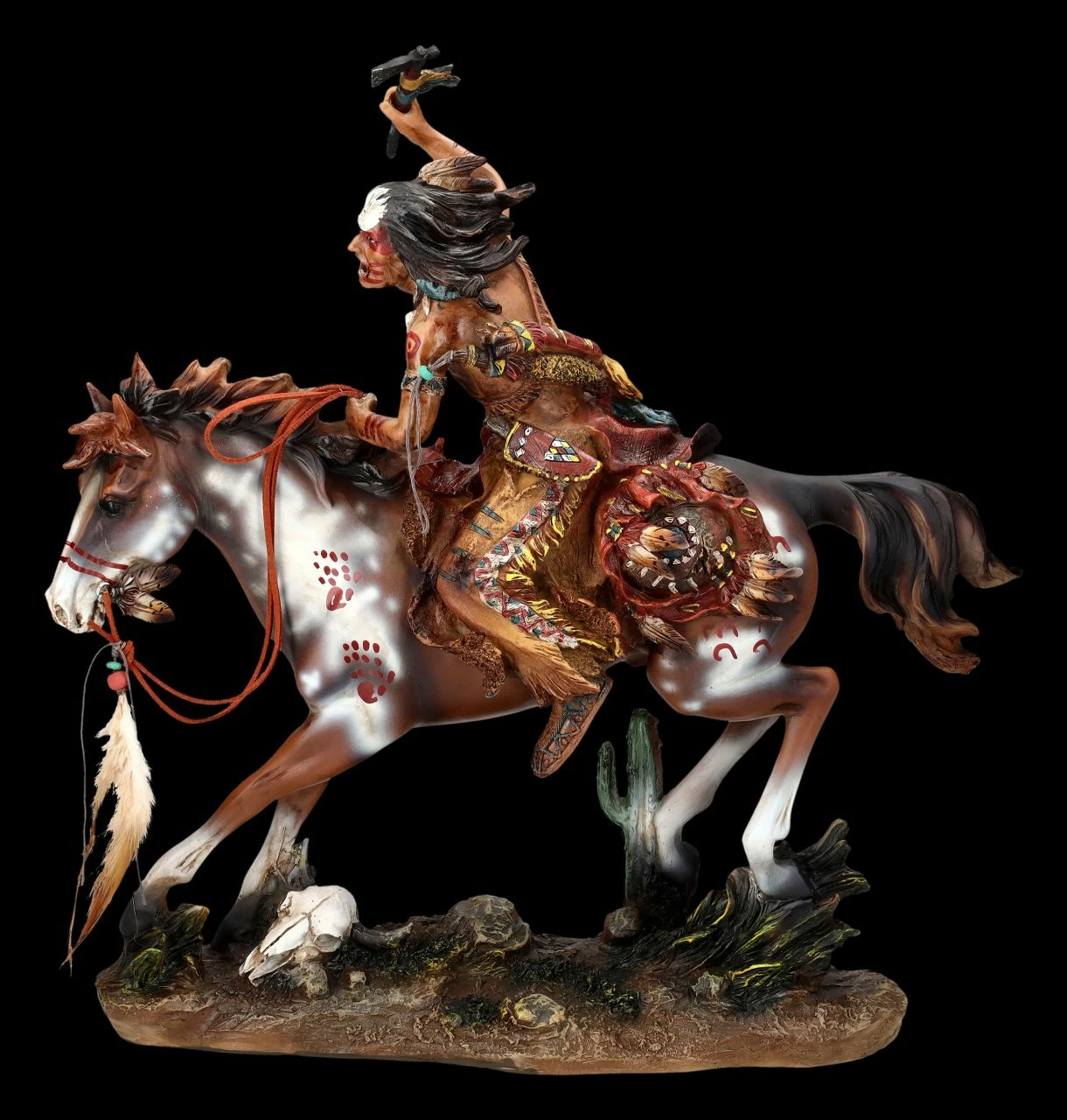Sein Tomahawk schwingend stürmt der indianische Krieger mit wildem Kampfgeschrei auf seine Feinde zu. Wie angewachsen sitzt er auf seinem Pferd, das jeder Handbewegung folgt. Der reitende Indianer trägt volle Kriegsbemalung und selbst sein Pferd hat er mit Stammeszeichen bemalt. Die fantastische Indianer Figur mit Tomahawk ist 40 cm hoch, 37 cm breit und 14 cm tief. Sie wurde aufwändig aus sorgfältig handbemalten Kunststein (Polyresin) gefertigt. Die kämpferische Indianer-Figur ist eine fantastische Deko für jeden Western-Saloon, eine Bar oder auch eine Trophäe bei Vorführungen in Western-Dörfern. Die mit echten Federn geschmückte detailreiche Figur wird überall zum absoluten Blickfang. Der Indianer mit Tomahawk ist aber auch ein perfektes Geschenk für jeden, der von Geschichten um den amerikanischen ‚Wilden Westen‘ und seiner indianischen Ureinwohner fasziniert ist.