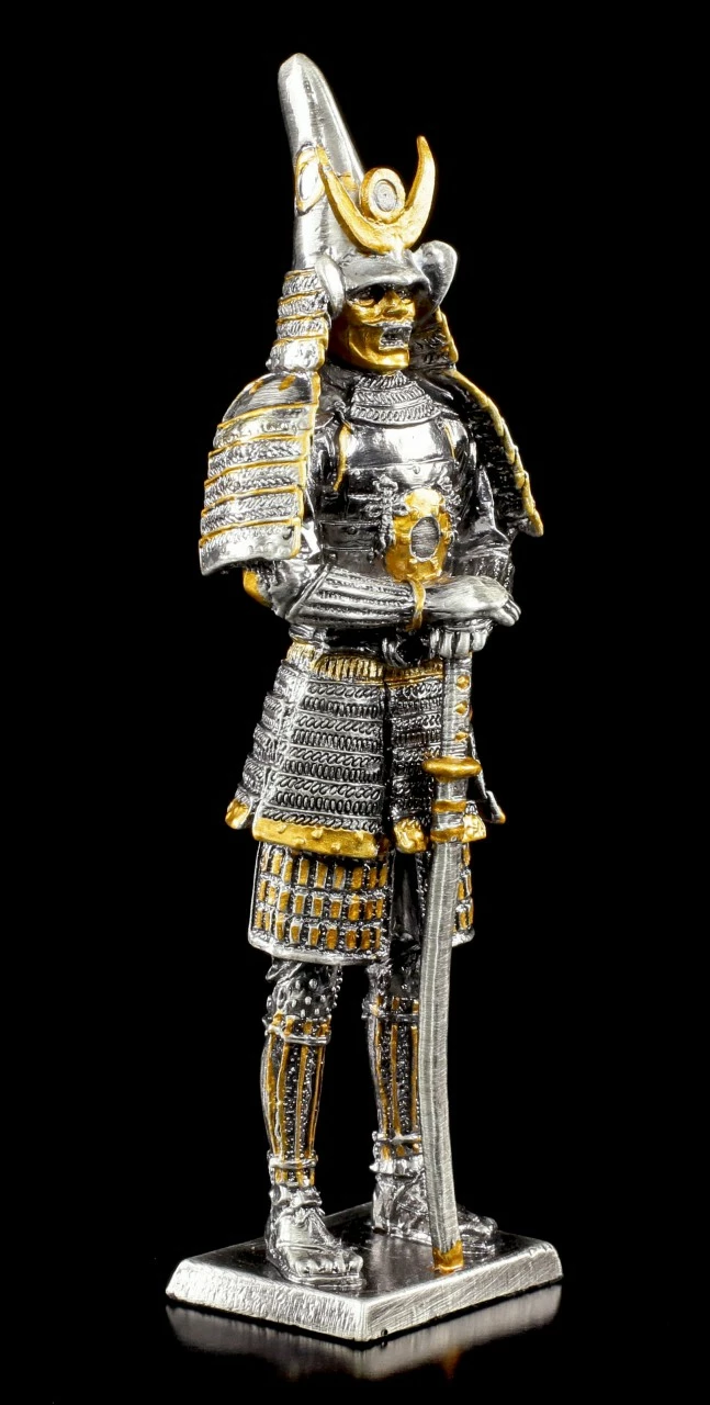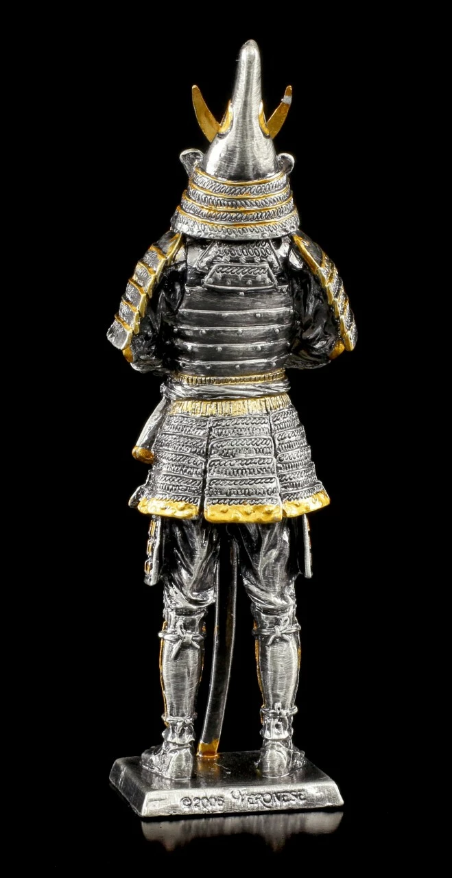 Furchterregend blickt diese detailreiche Zinn Samurai Figur Jutaro dem Betrachter entgegen. Veronese hat mit dieser kleinen Figur ein Kunstwerkt erschaffen. Die goldenen Akzente setzen sich hervorragend ab und die Rüstung des Samurai wirkt dadurch sehr edel.