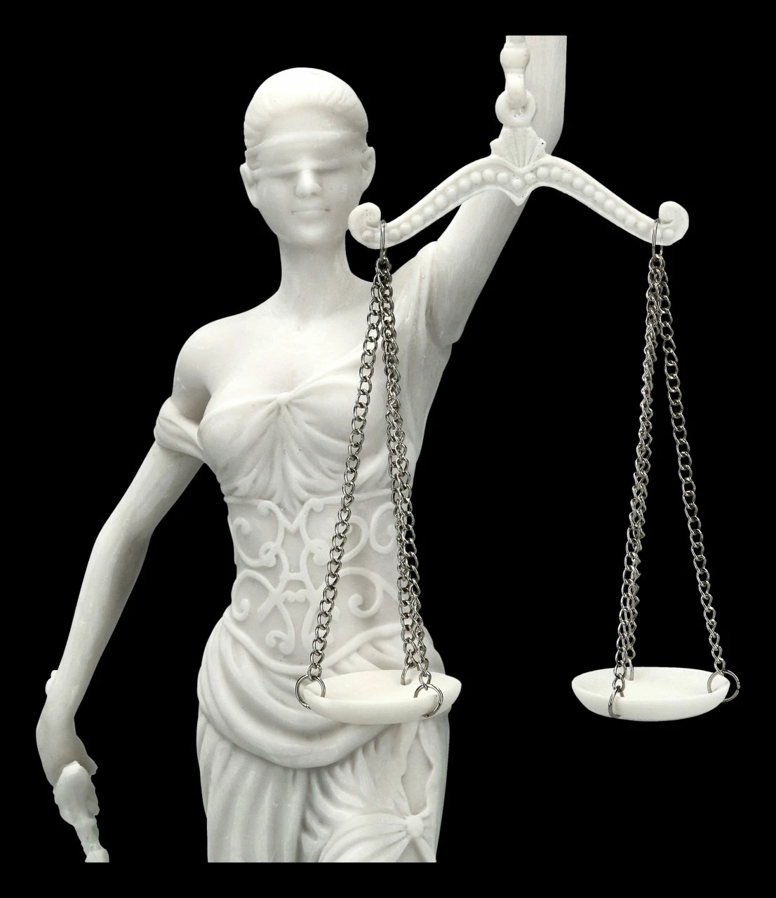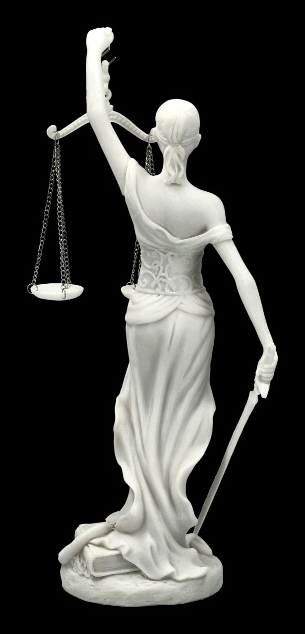Römische Göttin der Gerechtigkeit. Im Griechischen genannt Dike. Darstellung mit Waage (Abwägen der Sachlage), dem Richtschwert (durchführen der Entscheidung) und der Augenbinde (Unvoreingenommenheit)