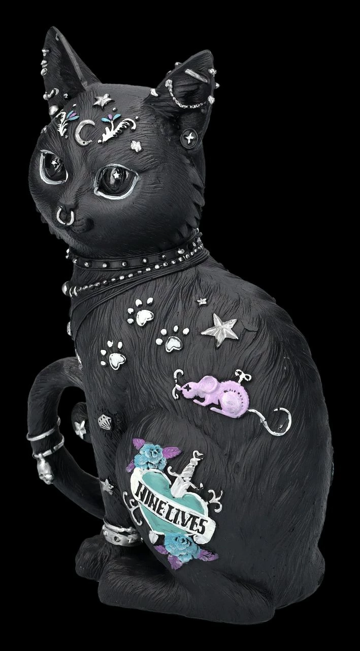 Sieben oder neun Leben, das ist hier die Frage. Die schwarze Katze hat sich für neun Leben entschieden und sich das auch – neben vielen magischen Symbolen – tätowieren lassen. Ein blaues, mit einem Schwert durchbohrtes Herz trägt eine Banderole mit der Aufschrift ‚Nine Lives‘. Na, wenn das nicht hilft! Die schwarze Katze mit den Tattoos ist 22 cm hoch, 13,5 cm breit und 9 cm tief. Sie wurde aus detailreich handbemaltem Kunststein (Polyresin) gegossen und ist für alle Hexen und Magier ein wunderbares Geschenk.