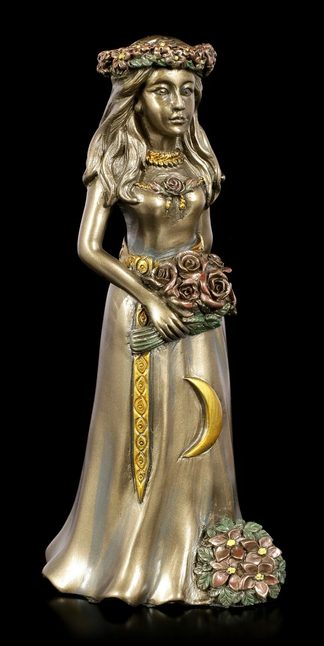 Die Jungfrau gilt in der keltischen Mythologie als eine Erscheinungsform der Dreifaltigen Göttin. Die Jungfrau verkörpert den Anfang des Lebens und die Jugend dar. Sie strebt nach Liebe. Sie wird oft mit einem Blumenkranz auf dem Kopf und mit Blumen in der Hand abgebildet. Die wunderschön bronzierte und colorierte keltische Göttin aus Kunststein (Polyresin) glänzt sanft im Licht und bringt so die keltische Mystik in Ihre Zimmerdekoration.