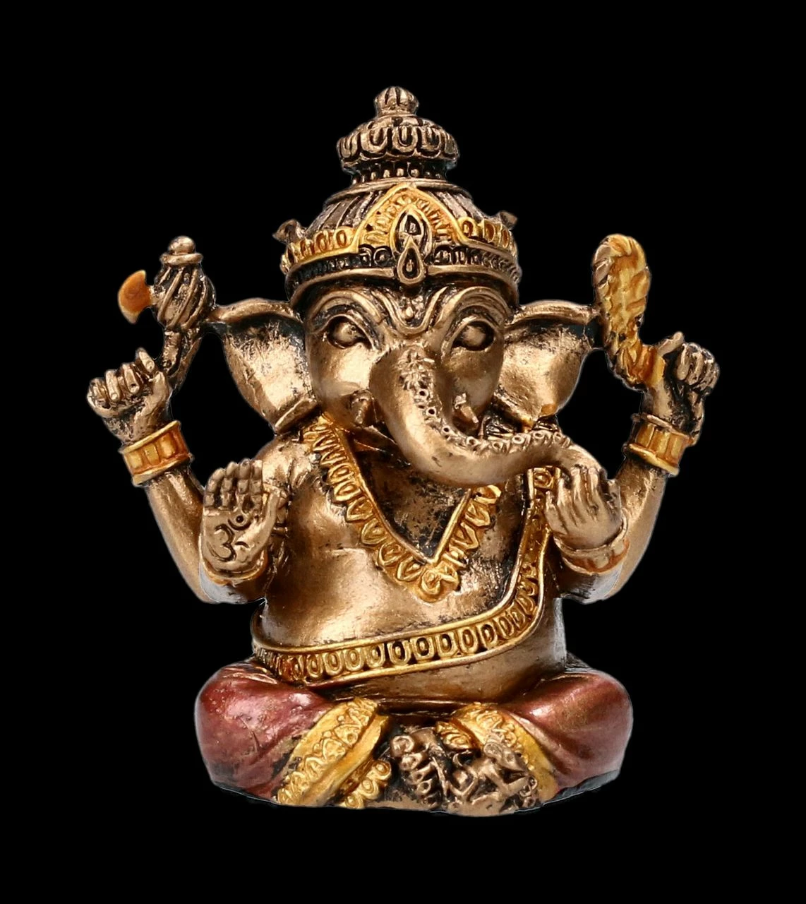 Ganesha mit dem Elefantenkopf ist als Gott der Weisheit, der Wissenschaften und der Künste im Hinduismus, aber auch im Buddhismus sehr beliebt. Seine vier Arme stellen Geist, Intellekt, Bewusstsein und die eigene Kraft dar. Die kleine Ganesha Figur aus sorgfältig handbemaltem Kunststein (Polyresin) ist 6,5 cm hoch, 6 cm breit und 4 cm tief. In Indien wird Ganesha auch von Schulkindern besonders geliebt, da er das Lernen fördern soll und damit ist er auch für Kinder ein schönes Geschenk.