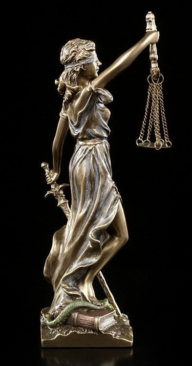 Römische Göttin der Gerechtigkeit. Im Griechischen genannt Dike. Darstellung mit Waage (Abwägen der Sachlage), dem Richtschwert (durchführen der Entscheidung) und der Augenbinde (Unvoreingenommenheit)