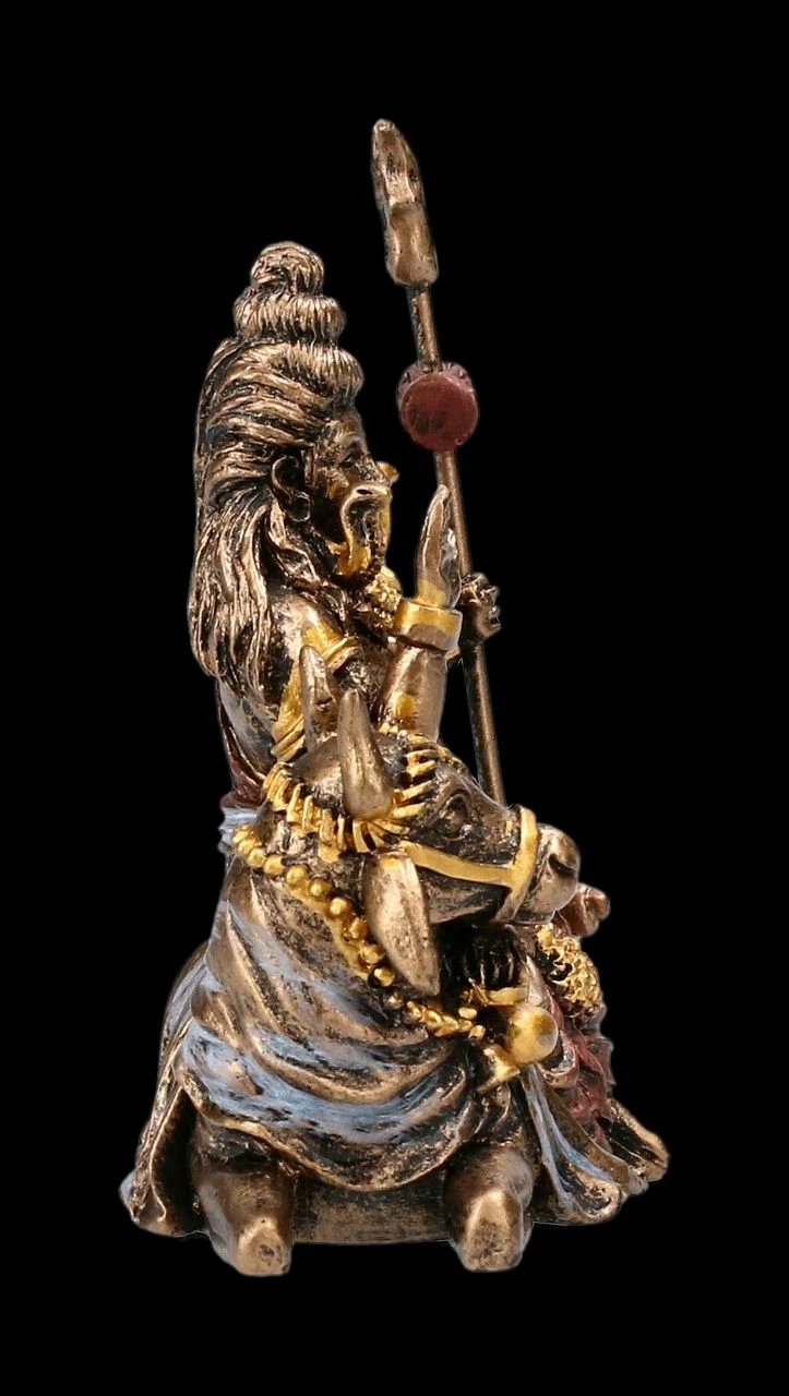 Einer der Hauptgötter des Hinduismus ist Shiva. Er vereinigt in sich die Gegensätze und steht einerseits für Schrecken und Zerstörung und ist dann aber wieder der gütige Gott und steht für den Neubeginn. Bei dieser kleinen Shiva Figur sitzt Shiva auf einer heiligen Kuh. In einer seiner vier Hände hält er einen Dreizack, der die drei Hauptgottheiten des Hinduismus, Brahma, Shiva und Vishnu, darstellen soll. Die kleine Lord Shiva Figur aus sehr schön handbemaltem Kunststein (Polyresin) ist 6,5 cm hoch, 6 cm breit und 4 cm tief.