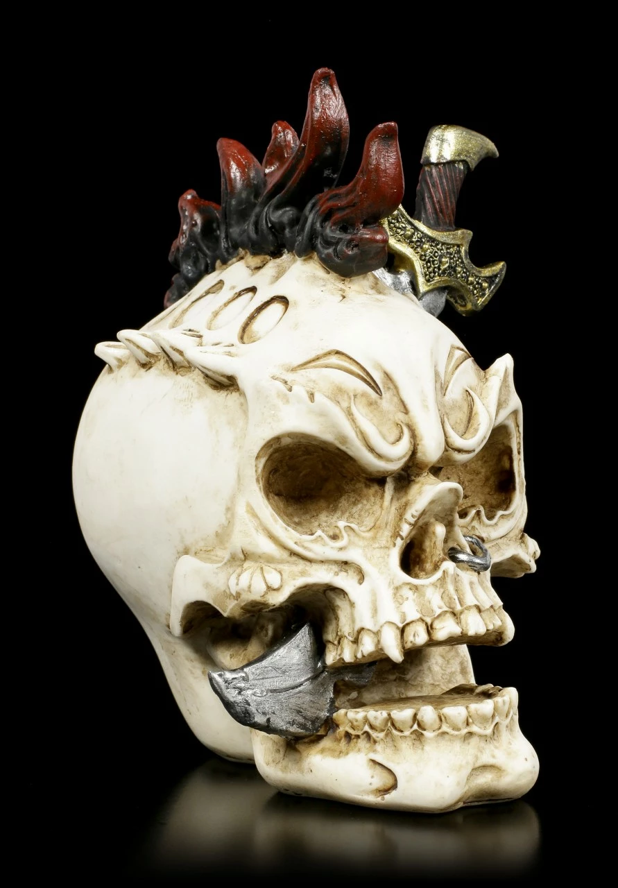 Wie der Dämon zu Tode kam, ist offensichtlich. Bei einem Kampf hat ihm sein Gegner einen Säbel durch den Schädel getrieben. Der ausgefallene Totenkopf aus handbemaltem Kunststein (Polyresin) besticht durch seine vielen Details und sollten in keiner Sammlung fehlen.