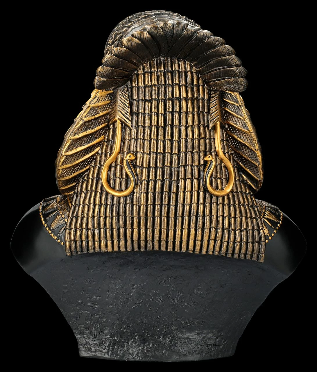 Die 52 cm hohe, 47 cm breite und 32 cm tiefe wunderbare, detailreiche Büste in XL aus sorgsam mit goldenen Akzenten handbemalten Kunststein (Polyresin) zeigt Kleopatra, die sagenumwobene Königin von Ägypten.