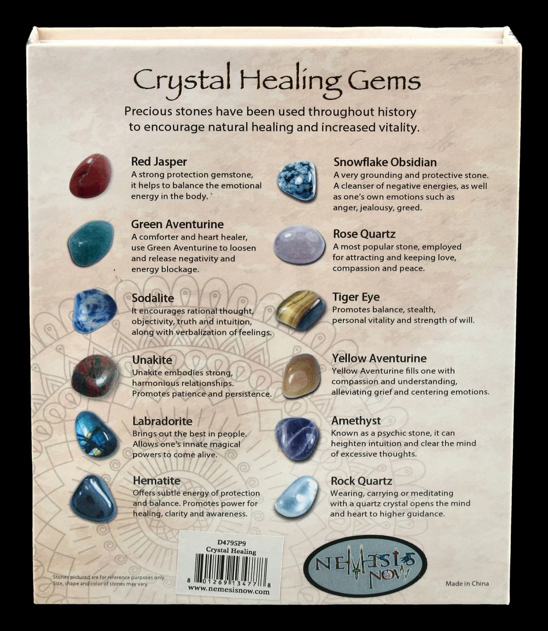 Die 12 Heilsteine helfen Ihnen dabei, positive Energie zu sammeln und das innere Gleichgewicht zu finden. Das umwerfende Heilstein-Set kommt in einem Stoffbeutel und in einer Geschenkverpackung. Die enthaltenen Steine sind: Roter Jaspis, Grüner Aventurin, Sodalith, Unakit, Labradorit, Hämatit, Schneeflockenobsidian, Rosenquarz, Tigerauge, Gelber Aventurin, Amethyst und Steinquarz. Die Bedeutung der Steine finden Sie in Englisch auf der Rückseite der Geschenkverpackung.