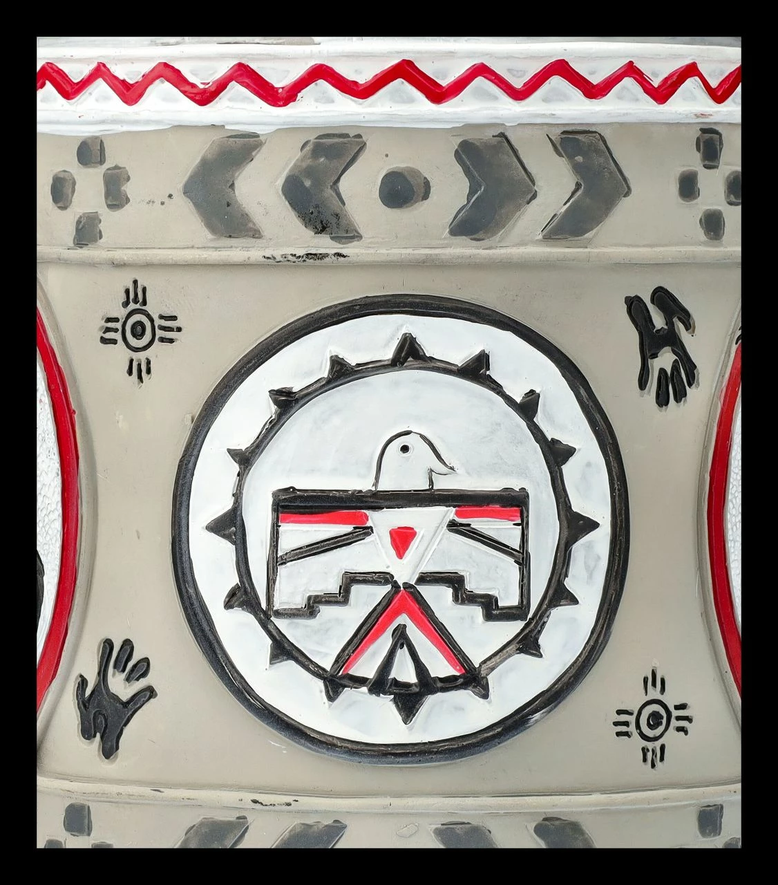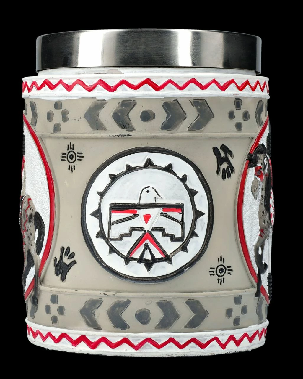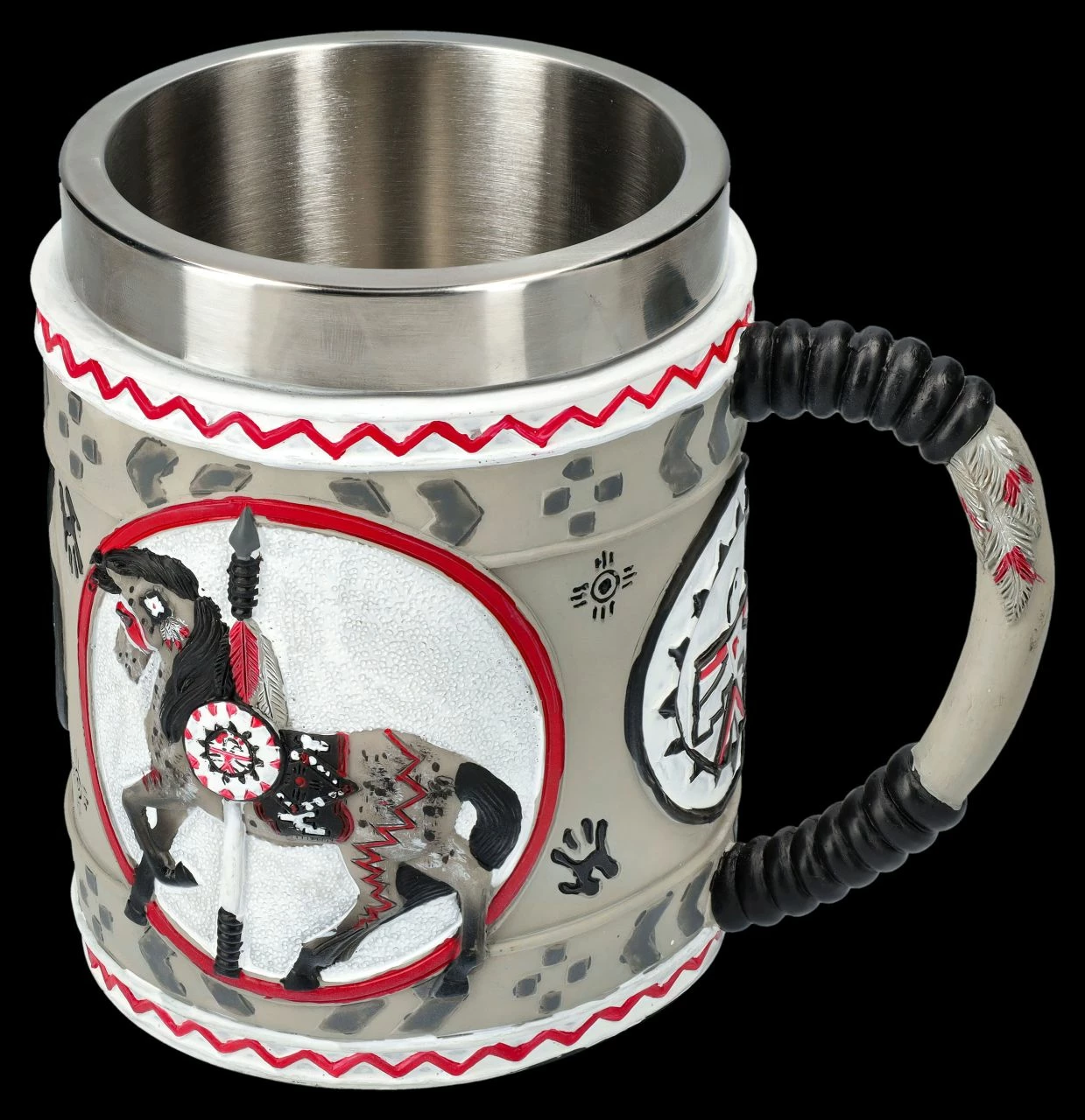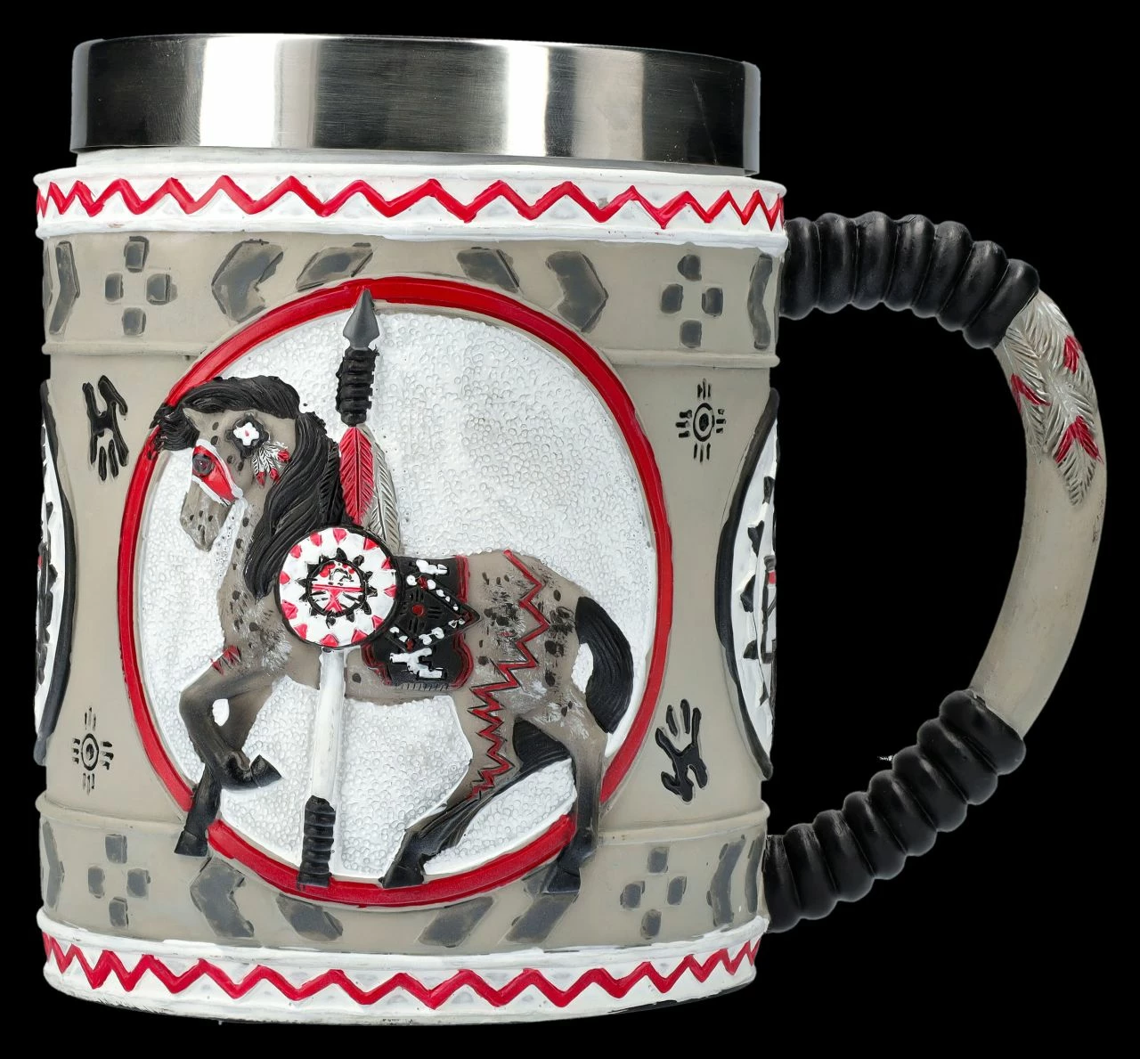 Aus der Serie ‚The Trail of Painted Ponies‘, einem der erfolgreichsten Kunstprojekte in den USA, bei dem sich zahlreiche Künstler mit ihren Pferdemotiven verewigen, stammt auch dieser farbenprächtige Krug. Das in einem roten ovalen Rahmen vor nebelig weißem Hintergrund abgebildeten Pferd ‚The Grey Ghost ‚ ist mit mystischen indianischen Stammessymbolen verziert. Der einzigartige Krug ist 13 cm hoch, 15 cm breit (ohne Henkel sind es 10 cm) und 10,5 cm tief. Der prächtige Krug mit dem geheimnisvollen ‚Grey Ghost‘ ist detailreich aus handbemaltem Kunststein (Polyresin) gefertigt und nicht nur dekorativ, sondern auch für alle Sammler der bunten Pferde ein fantastisches Geschenk voller Magie. Zur leichteren Reinigung hat der Krug einen herausnehmbaren Einsatz aus Edelstahl mit einem Fassungsvermögen von ca. 500 ml.