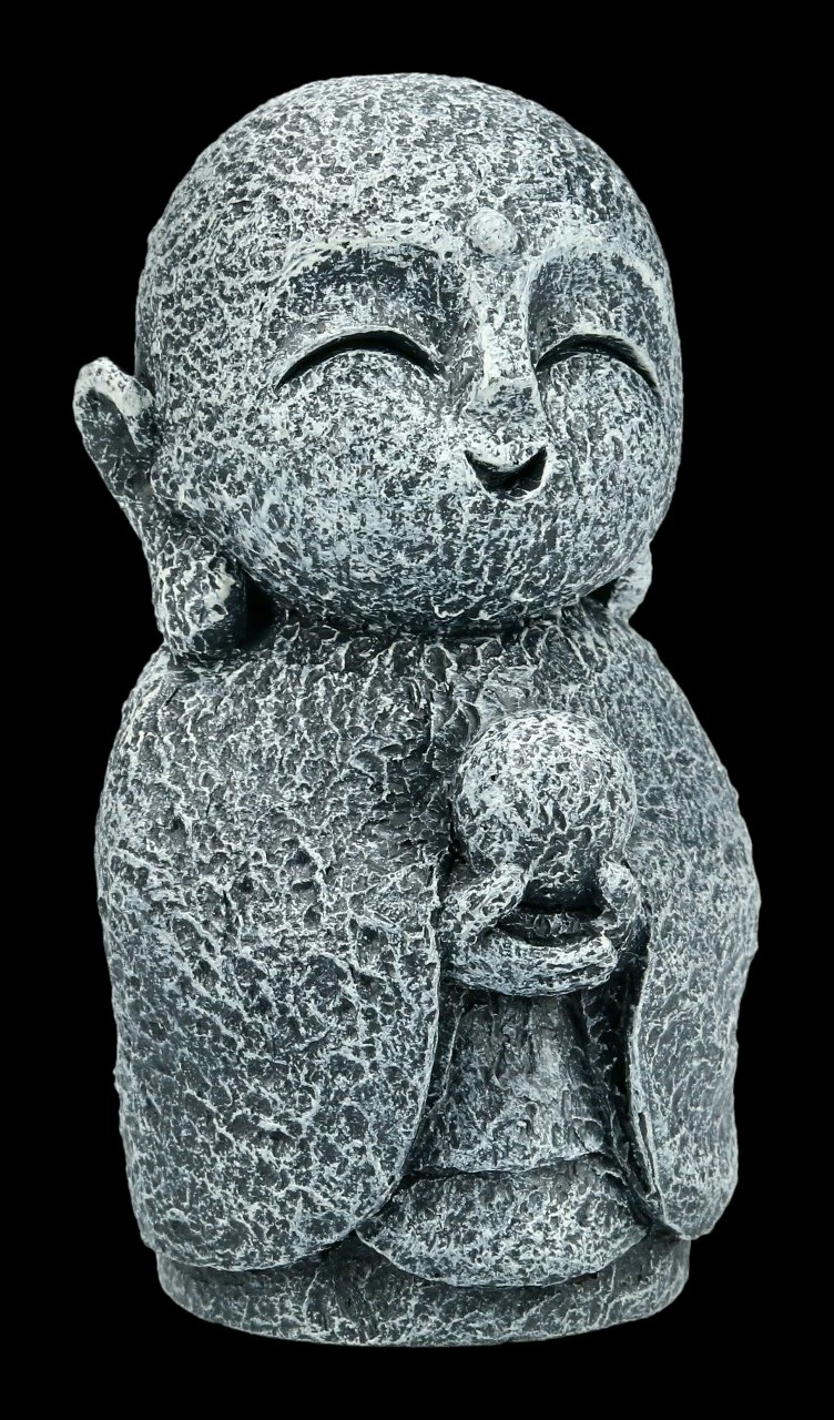 Die Jizo oder Kshitigarbha-Figuren gehören zu den populärsten Figuren Japans und werden oft mit einer Wunscherfüllungsperle dargestellt. Die kleine buddhistische Mönch-Figur mit der Perle sieht aus wie aus einem kleinen Stein gehauen und wirkt mit dem lächelnden Gesichtsausdruck sehr liebevoll. Die kleine Mönch-Figur ist 7,5 cm hoch, 4 cm breit und 4 cm tief. Sie ist aus sorgfältig handbemaltem Kunststein (Polyresin) gefertigt und passt sehr gut in einen kleinen Zen-Garten oder vor einen Glücksbambus.