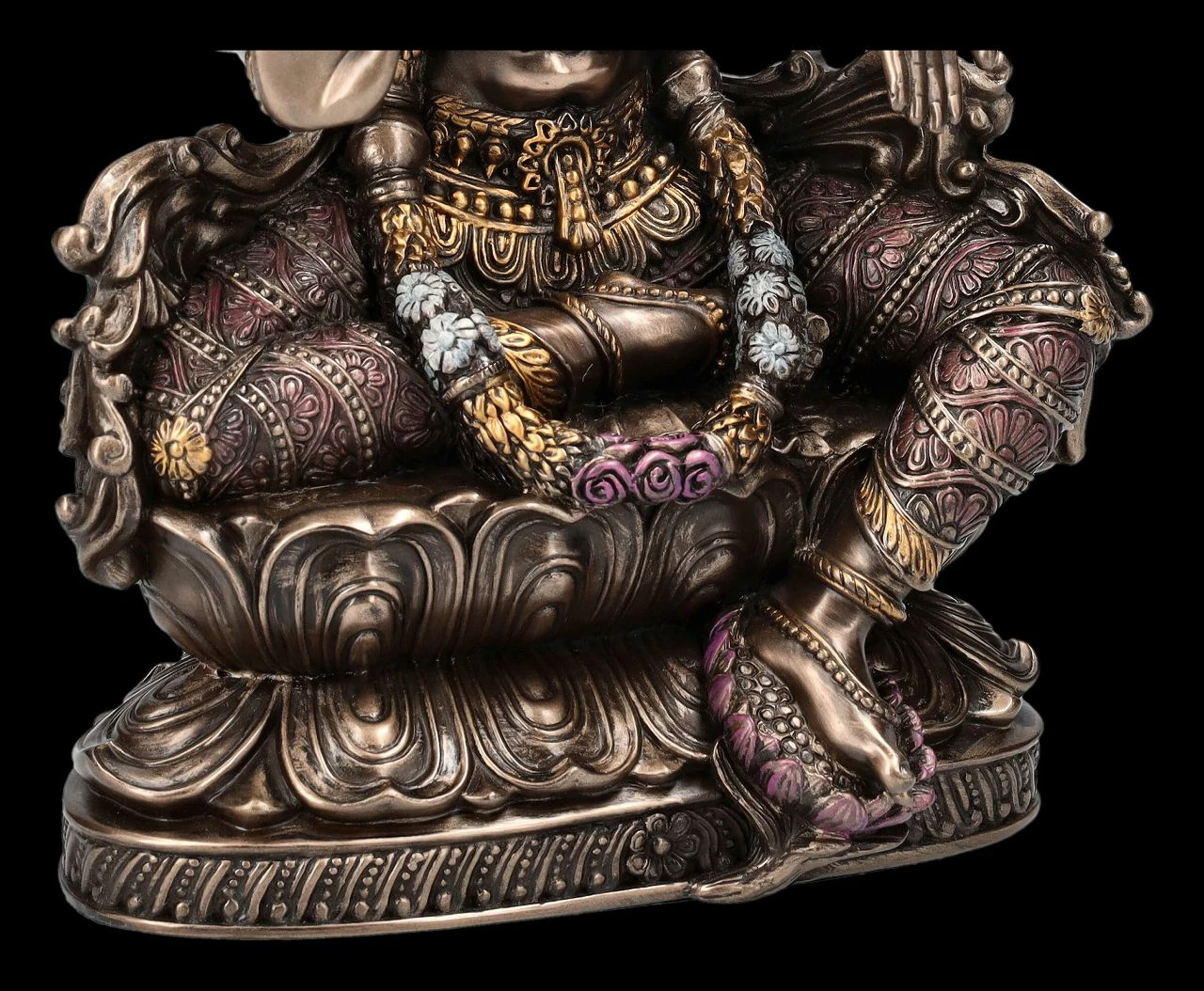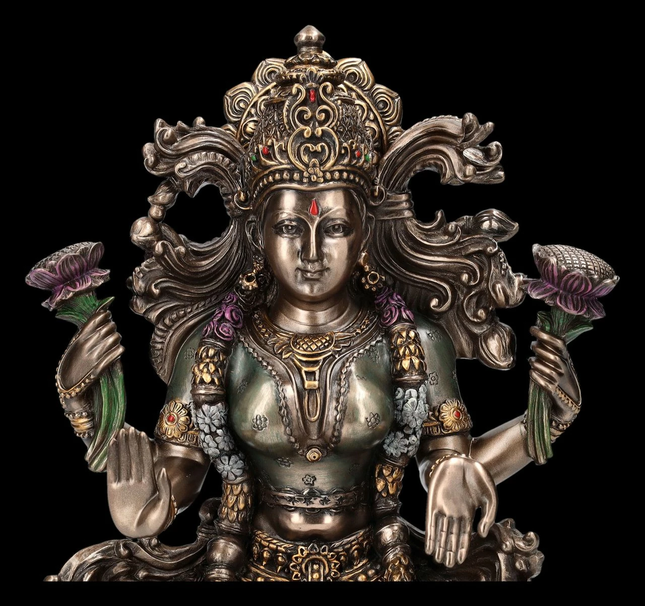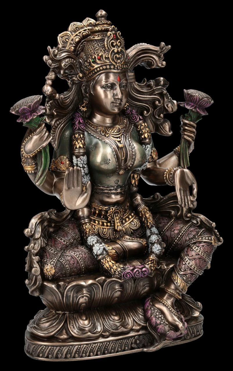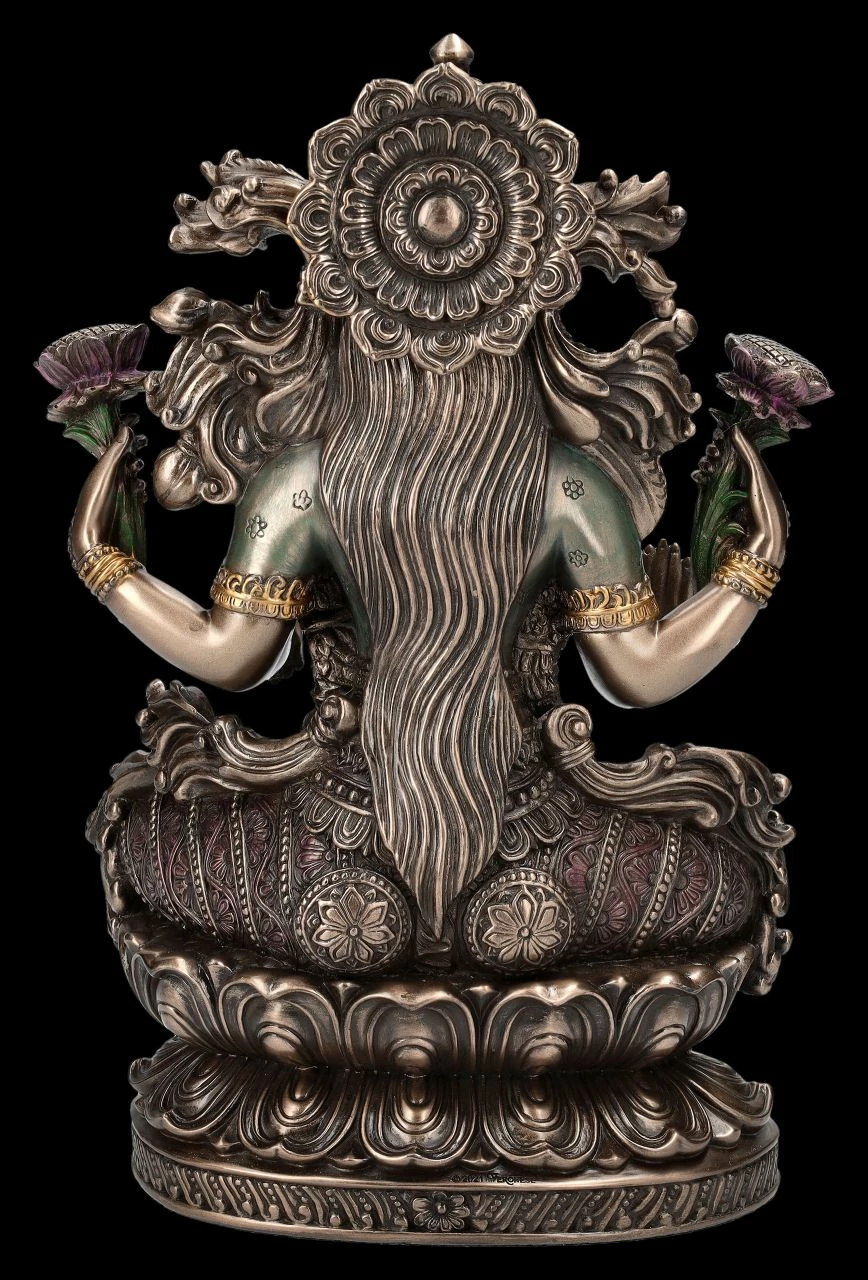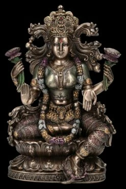 Die wunderbare, reich verzierte Skulptur von Lakshmi, der hinduistischen Göttin des Glücks, der Liebe, der Fruchtbarkeit, der Gesundheit und des Wohlstandes stammt aus der Studio Collection von Veronese. Die 23 cm hohe, 15,5 cm breite und 10 cm tiefe Figur der Göttin auf dem Lotusthron wurde sorgfältig und detailreich aus edel bronziertem und außerordentlich fein coloriertem Kunststein (Polyresin) gefertigt. Sie ist nicht nur wunderschön anzusehen, sondern bringt auch ein edles asiatisches Feeling in jedes Ambiente. Die schöne Lakshmi Skulptur auf dem Lotusthron ist auch als Glücksbringerin ein wunderbares Geschenk. Schließlich wird die Göttin Lakshmi in der hinduistischen Mythologie nicht nur als Spenderin von Wohlstand, Fülle und Überfluss, sondern auch als Göttin für Fruchtbarkeit, für Schönheit, Reinheit, Liebe und Glück verehrt.