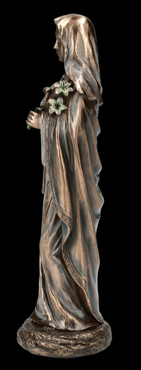 Wunderbar detailreich und kunstvoll ist diese Madonna Figur aus der Studio Collection von Veronese. Die Darstellung der Madonna als ‚Unbefleckte Herz Marias‘ gehört zur katholischen Spiritualität und symbolisiert die Reinheit, Heiligkeit und Vollkommenheit des Herzens und ist in zahlreichen Kirchen so zu finden. Für die katholische Kirche hat das ‚Unbefleckte Herz‘ eine große Bedeutung für die Rettung der Welt. Bei dieser detailreichen Figur hält Maria ihre rechte Hand auf dem mit einem Dolch durchbohrten flammenden Herzen. Bis zu den einzelnen Details, wie dem roten Herzen, dem zarten Gesichtsausdruck und der Kleidung mit der Bordüre auf dem Umhang ist die edel bronzierte und fein colorierte Madonna Figur aus Kunststein (Polyresin) einfach zauberhaft dargestellt. Die 21 cm hohe, 6,5 cm breite und 6 cm tiefe Figur Marias mit dem ‚Unbefleckten Herzen‘ schmückt jeden Altar und ist auch ein wunderbares Geschenk für jeden, der auf die Kraft und Stärke Marias vertraut.