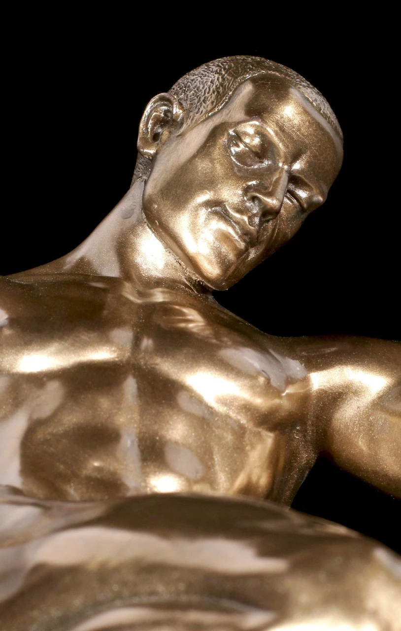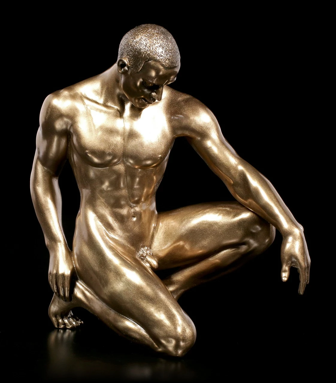 Der männliche Akt wird durch die erotische Pose zu einem sinnlichen Kunstwerk, das stilvoll zu einem Blickfang auf einem Tisch wird. Wunderschöne Bronze-Optik wie von Veronese üblich.
