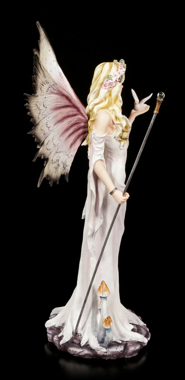 Isahia mit weißer Taube ist eine wunderschöne Kunststein Elfen Figur in Pastellfarben. Mit Ihrem Zepter, dem langen edlen Gewand und dem Blumenkranz im Haar wirkt sie wie die Königin der Elfen.