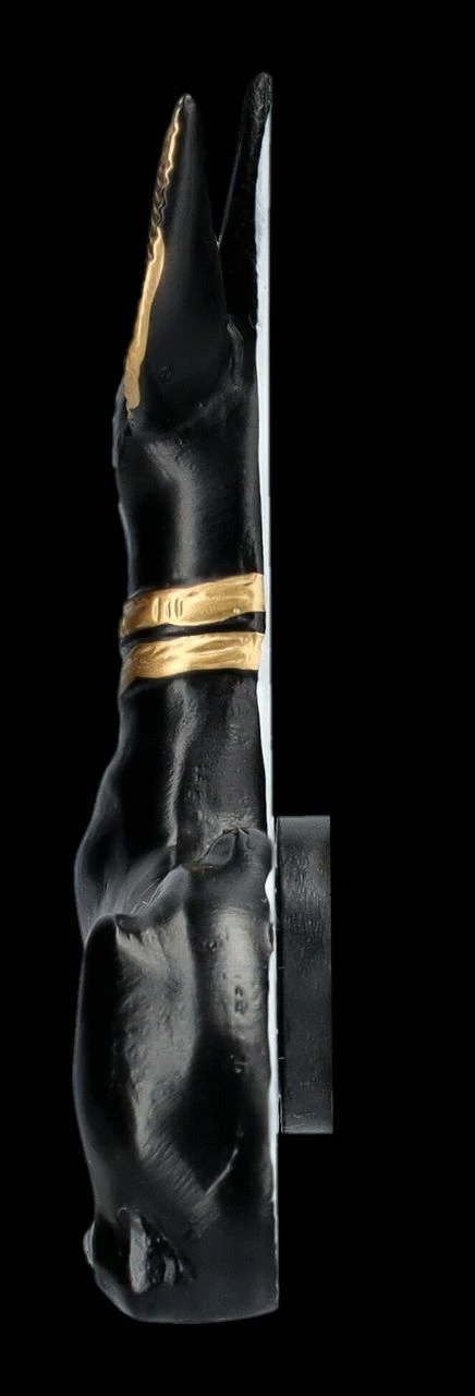 In der Götterwelt des Alten Ägypten gehörte Anubis zu den wichtigsten Göttern, denn er war für die Totenriten verantwortlich. Der faszinierende, 5,5 cm hohe, 7,5 cm breite und 1 cm tiefe Magnet aus handbemaltem Kunststein (Polyresin) zeigt Anubis als schwarzen Schakal, wie man ihn von zahlreichen Abbildungen kennt. Durch die wenigen goldene Akzente wirkt der Magnet mit Anubis sehr kunstvoll. Der Magnet befindet sich auf der Rückseite..