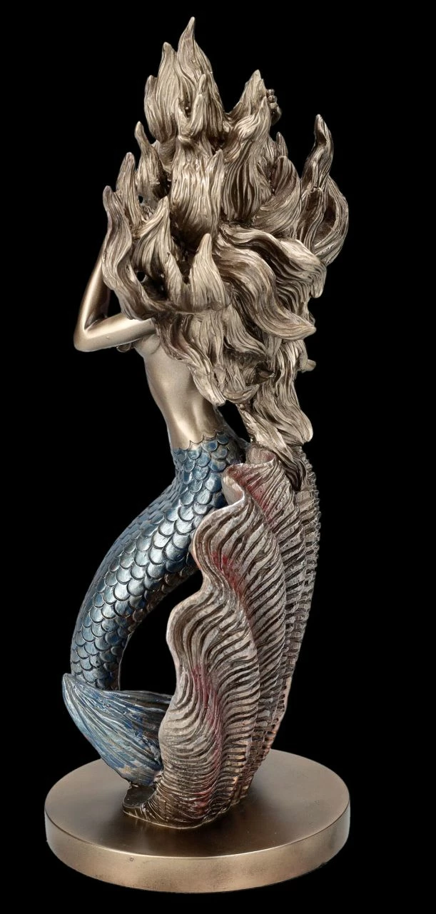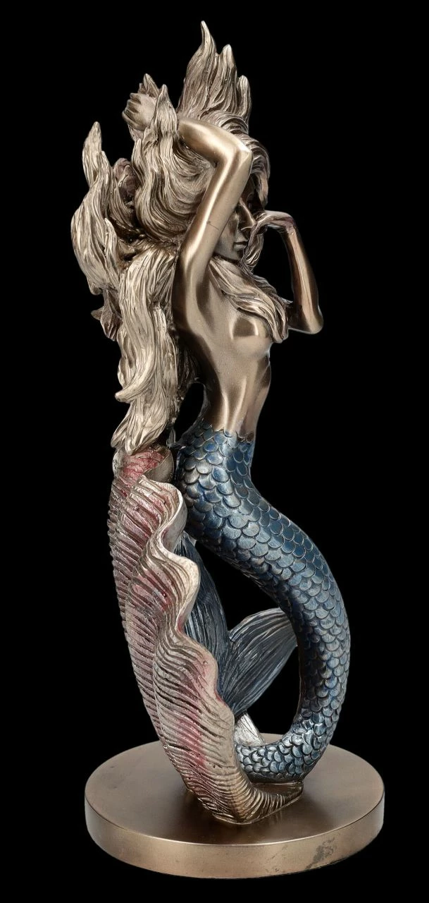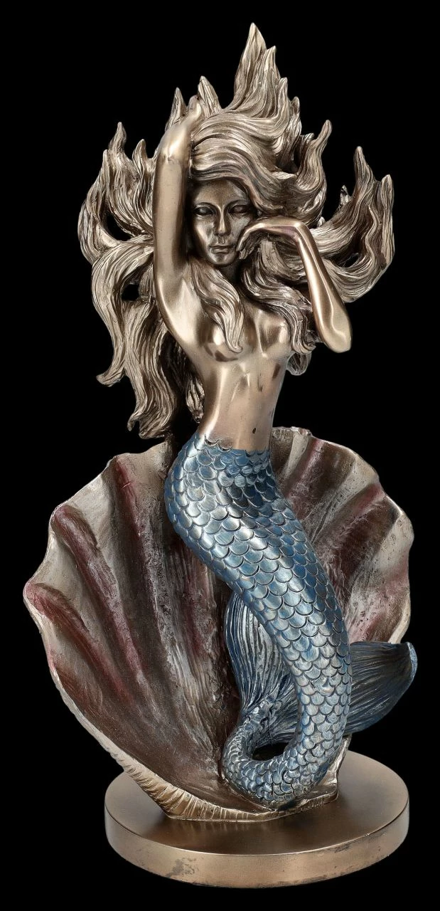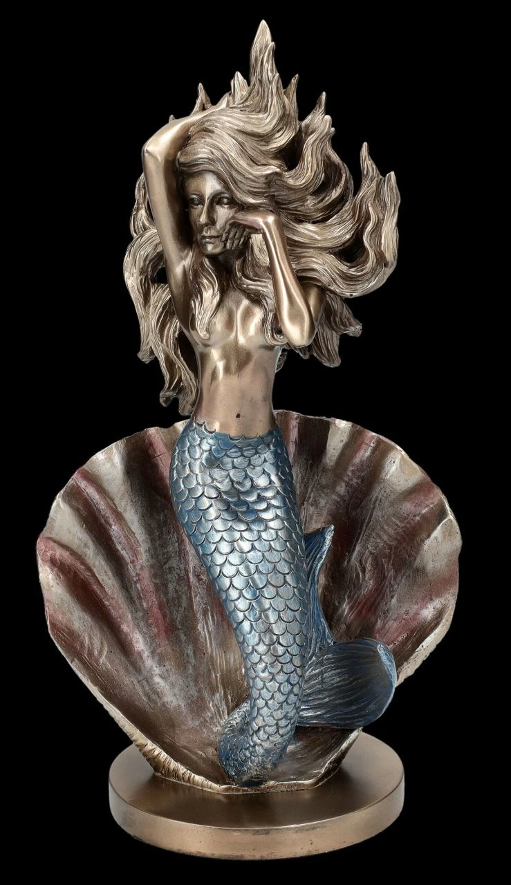 Dass man in Muscheln Perlen finden kann, ist sicherlich jedem bekannt. Aus dieser offenen Muschel entsteigt jedoch eine wunderschöne Meerjungfrau. Halb Fisch und halb wunderschöne junge Frau räkelt sich die schöne Meerjungfrau verführerisch vor der Muschel. Ihre langen Haare wehen in der Brise des Meeres. Das ist ein Motiv, das im Jugendstil von vielen Künstlern aufgenommen wurde. Auch diese von Hand bemalte schöne Skulptur aus hochwertigem Kunststein (Polyresin) wirkt beinahe wie ein Kunstobjekt aus der Jugendstil-Epoche. Die Skulptur der Meerjungfrau vor der Muschel ist 30,5 cm hoch, 16,5 cm breit und 11,5 cm tief. Sie ist ausgesprochen dekorativ und wird auf jedem Sideboard zum sofortigen Blickfang.