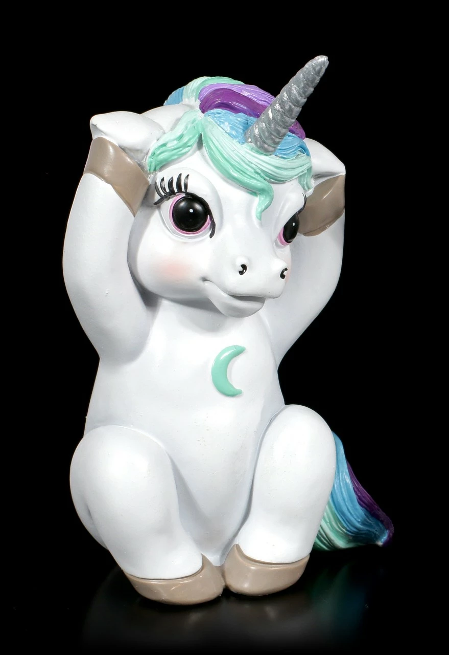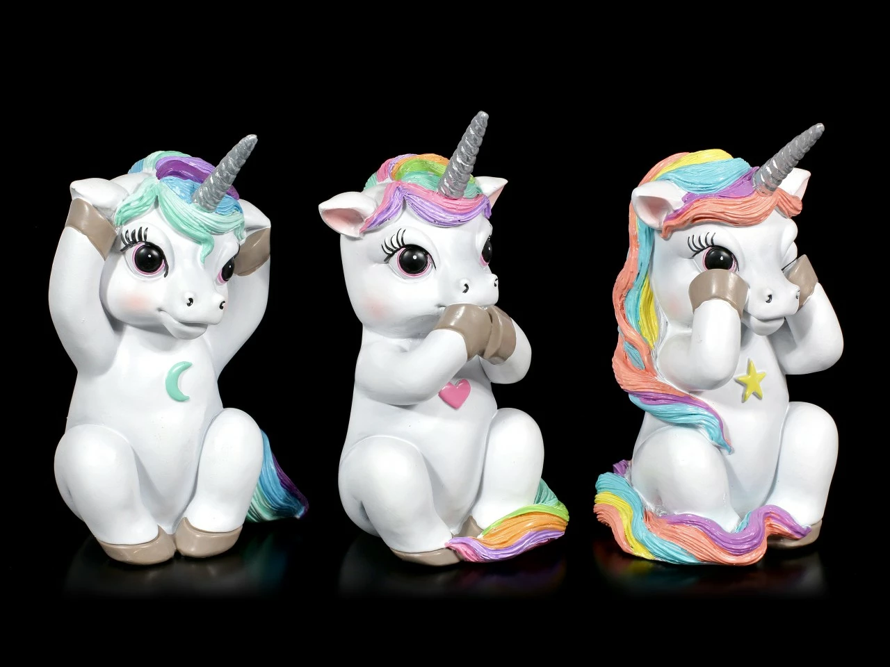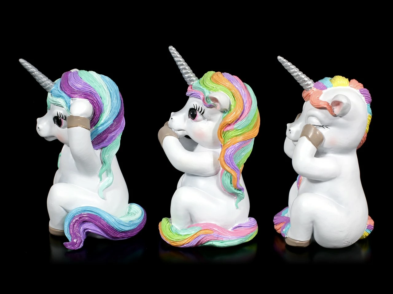 Die süßen drei Regenbogen Einhörner verkörpern Nichts Böses Hören, Sagen, Sehen. Das Kunststein Trio wurde liebevoll handbemalt und ist ein perfektes kleines Mitbringsel oder Geschenk für einen Sammler.