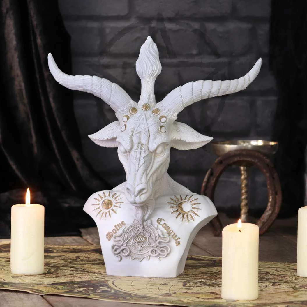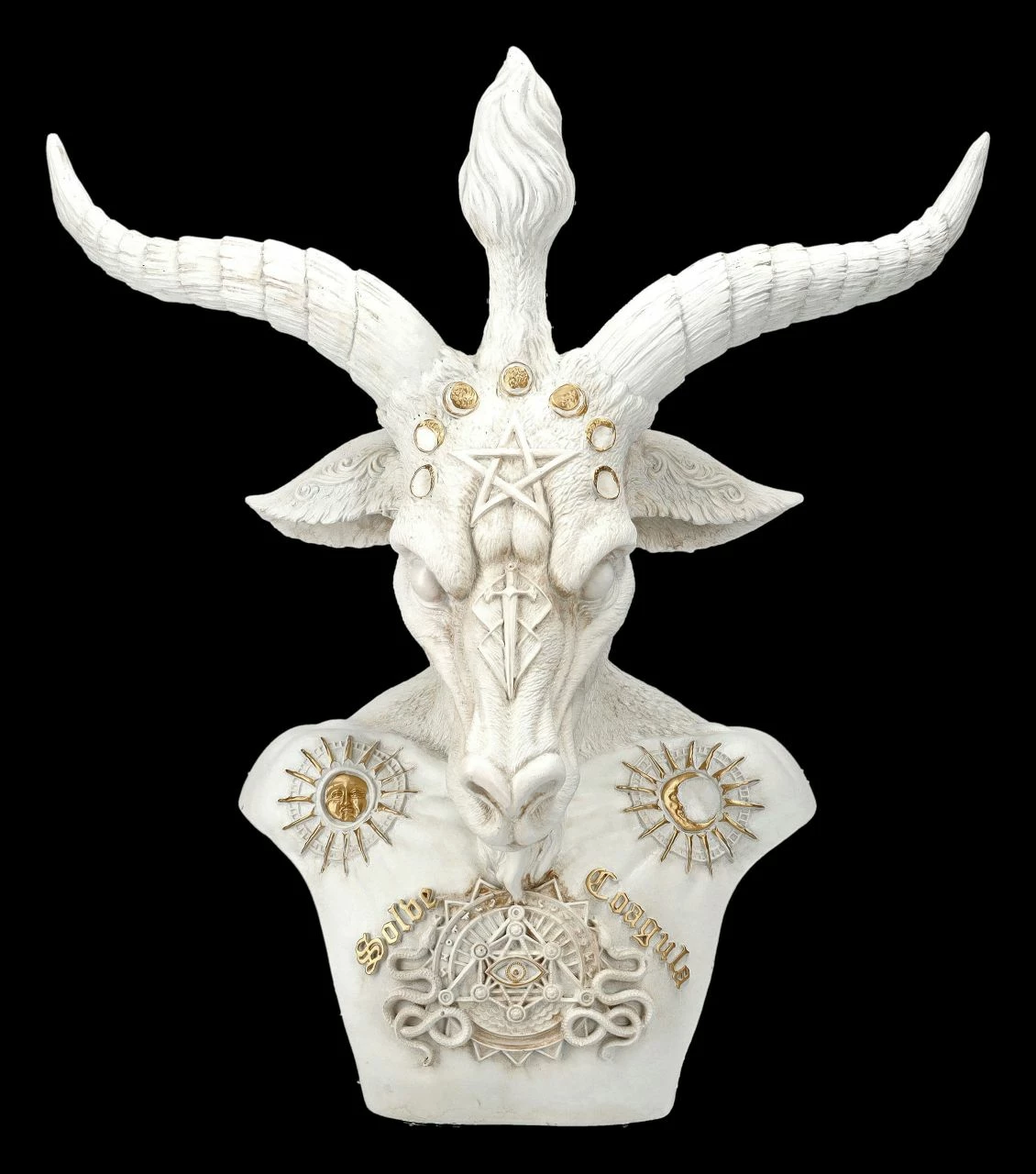 Faszinierend und edel ist diese weiße Büste des Baphomet mit den wenigen goldenen Akzenten in den zahlreichen Symbolen.‘ Löse und verbinde‘ – also füge es zu einem anderen Ganzen wieder zusammen – bedeutet die alchemistische Formel ‚Solve et coagula‘ über den Freimaurer-Symbolen auf der Brust der okkulten Baphomet-Figur mit dem Pentagramm auf der Stirn. Aber auch die Symbole der Zwillingsbrüder Cautes und Cautopates aus dem Mitraskult, wie der Morgen durch die Sonne und der Abend durch den Mond auf den Schulterblättern der Baphomet Büste lassen viele Deutungen zu. Schließlich vereint Baphomet Frau und Mann, Gut und Böse, Mensch und Dämon, Mensch und Tier. So ist es nicht verwunderlich, dass die Symbole aus allen alten Kulturen bekannt sind. Die schöne Baphomet Büste von Nemesis Now aus handbemaltem und detailreich gefertigtem Kunststein (Polyresin) mit der Höhe von 34 cm, der Breite von 30,5 cm und der Tiefe von 15 cm ist in ihrer zurückhaltenden Form- und Farbgebung ein magischer Blickfang