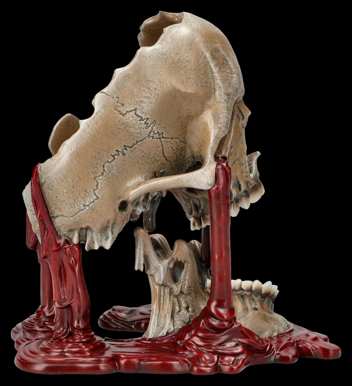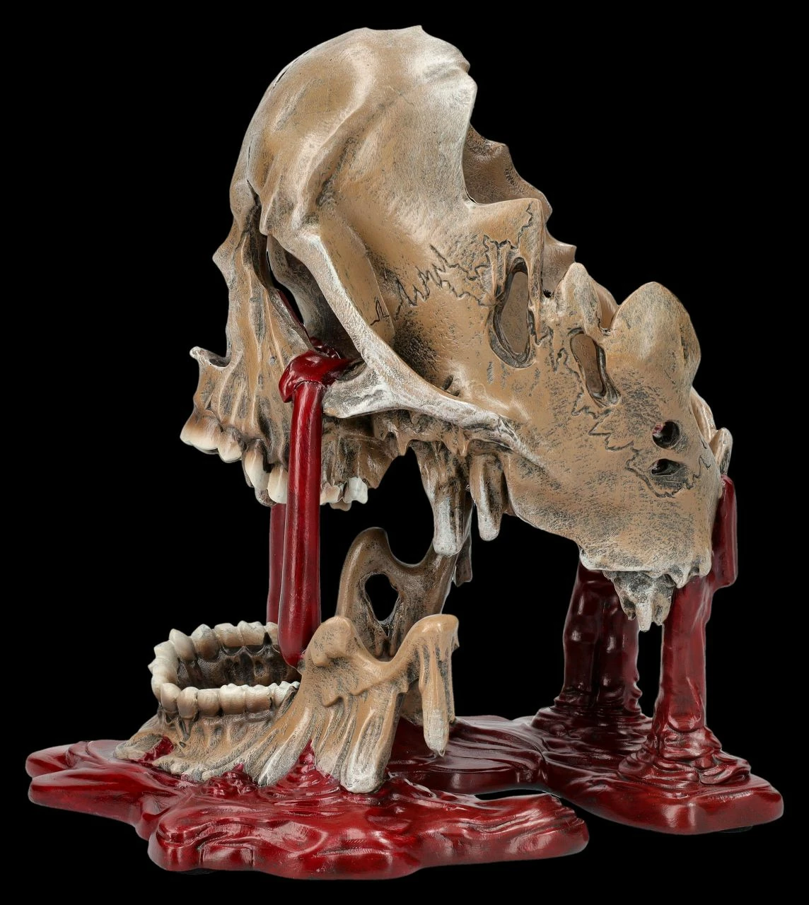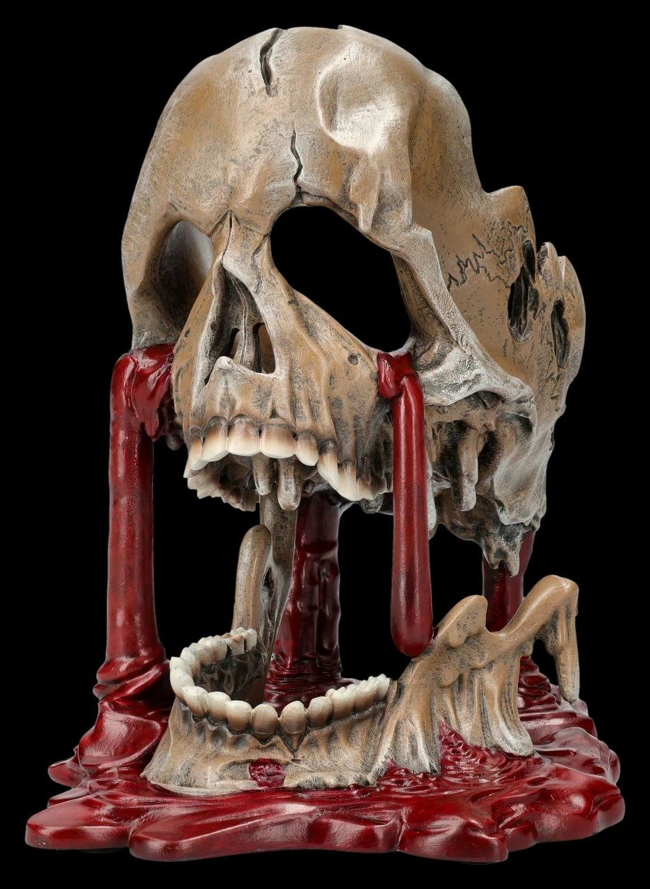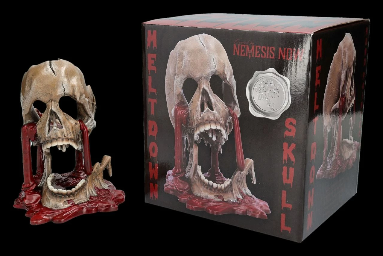 Selbst für hartgesottene Totenkopf-Sammler ist diese Skulptur mit dem schmelzenden Totenkopf und den Blutströmen, die aus ihm herauszufließen scheinen, eine ziemlich gruselige Angelegenheit. Dann heißt diese Skulptur auch noch ‚Meltdown‘, also ‚Kernschmelze‘. Der 17 cm hohe, 13 cm breite und 16,5 cm tiefe Totenkopf von Nemesis Now ist detailreich aus handbemaltem Kunststein (Polyresin) entstanden und wahrlich – vielleicht sogar als Warnung – ein ganz besonderer Blickfang, der eher Schrecken verbreitet. Der gruselige Totenkopf mit Blut kann aber auch verschenkt werden und kommt mit einem toll bedruckten Geschenkkarton.