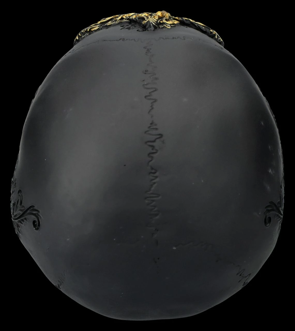 ‚Divine Demise‘ – also ‚Göttlicher Untergang‘ nennt Nemesis Now diesen kunstvollen, reich verzierten schwarzen Totenkopf. Die goldenen Verzierungen, wie z.B. das Pentagramm auf dem Schädel und die goldenen Zähne geben dem schwarzen Totenkopf ein prachtvoll barockes Aussehen. Auf den Tafeln der ‚Reichen & Schönen‘ dienten in der Zeit des Barock bei ihren morbiden Festen durchaus reich verzierte Totenköpfe als Dekoration. Wie wäre es dann mit diesem herrlich verzierten Schädel für das nächstes Fest? Der Totenkopf aus hochwertigem Kunststein (Polyresin) wurde sorgsam von Hand bemalt. Er ist 12,5 cm hoch, 10 cm breit und 15,5 cm tief und kommt mit einem bedruckten Geschenkkarton. Der edle schwarz-goldene Schädel ist also auch als außergewöhnliches Geschenk geeignet.