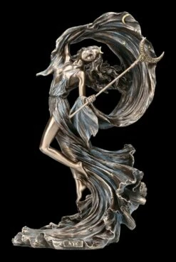 Nyx, die Göttin der Nacht, gehört in der griechischen Mythologie zu den Urgöttern und wurde als Tochter des Chaos geboren. Ihre Geschwister sind Gaia, Erebos, Eros und Tartaros. Sie war von unglaublicher Schönheit, was auch bei dieser wunderschönen Nyx Figur aus der Studio Collection von Veronese zu sehen ist. Die außerordentlich attraktive Figur der Göttin Nyx trägt eine Mondsichel als Schmuck auf ihrem Haar und einen Stab mit Mond und Mondsichel in ihrer Hand. In fließenden Wellen umschmeichelt sie ihr Kleid, das, wie auch der Schleier, der sie umweht, mit Sternen besetzt ist. Die edel bronzierte Figur der Göttin Nyx ist sehr aufwändig aus Kunststein (Polyresin) gefertigt und zart coloriert. Mit der Höhe von 28 cm, der Breite von 18 cm und der Tiefe von 12 cm wird die wunderschöne Göttin der Nacht mit Sicherheit überall sofort entdeckt und bewundert werden.
