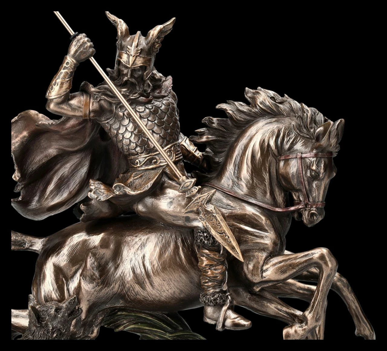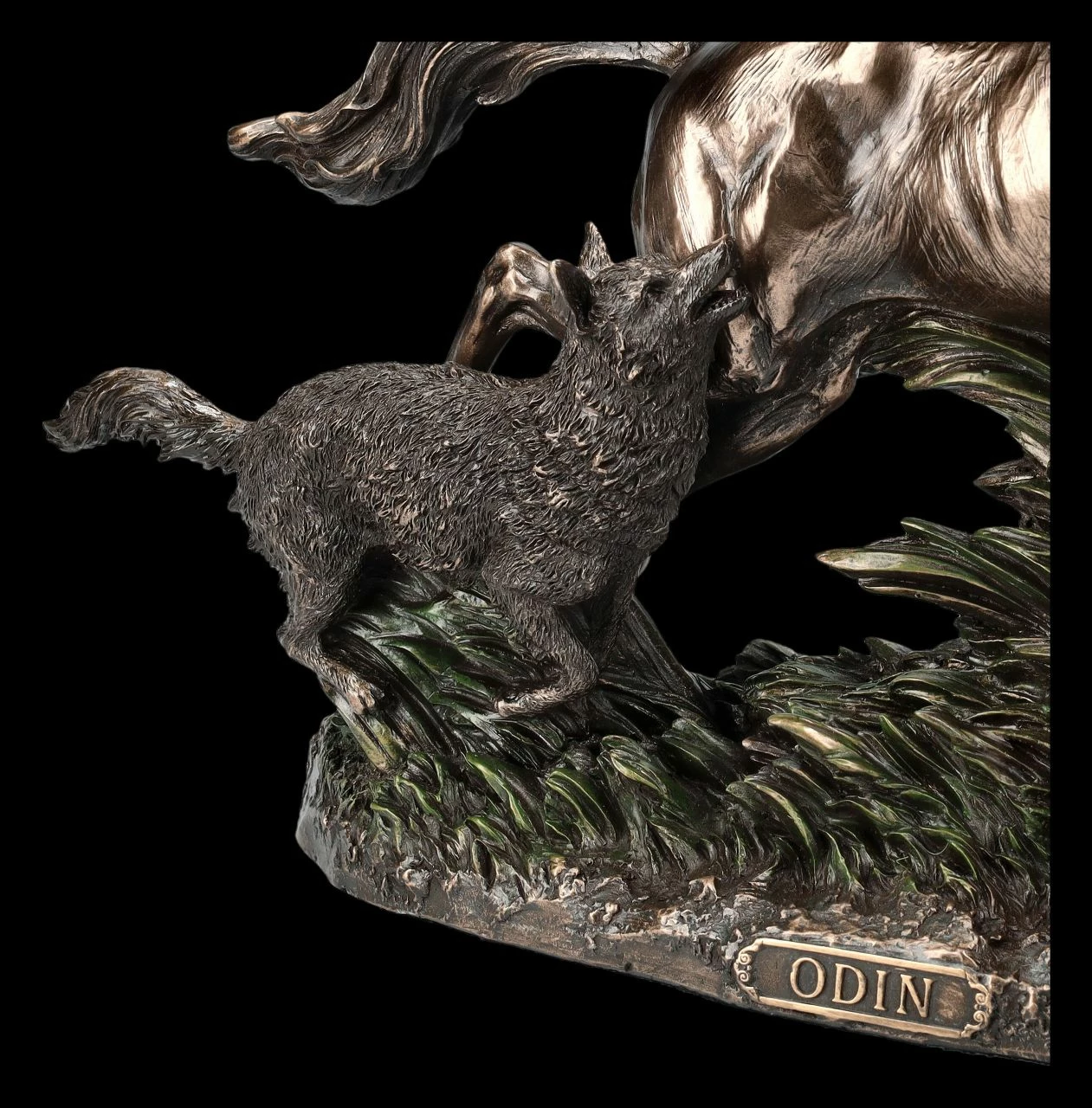 Der Göttervater Odin reitet auf seinem achtbeinigen Pferd Sleipnir. Er wird von einem Wolf begleitet. Wohin wohl seine Reise geht?