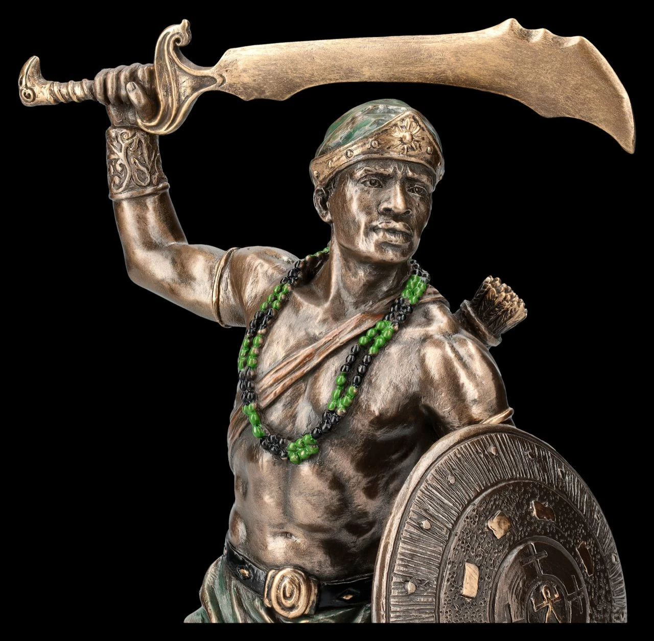 Oggun, der Yoruba Gott des Krieges aus der Studio Collection von Veronese ist detailreich aus edel bronziertem und schön coloriertem Kunststein (Polyresin) gefertigt. Oggun ist in der Religion der Yoruba, die in Westafrika, in der Karibik bis Zentral- und Südamerika von den Yoruba praktiziert wird, nicht nur Gott des Krieges und des Kampfes, sondern auch Gott des Eisens, der Mineralien, der Wälder, aber auch der Schlüssel, der Gefängnisse und der Werkzeuge. Er gilt damit auch als Schutzpatron der Schmiede, Ingenieure, Mechaniker und Soldaten. Dafür steht der Kessel mit dem Handwerkszeug zu Füßen dieser athletischen Götter-Figur. Als Gott des Krieges trägt Oggun einen Köcher mit Pfeilen auf seinem Rücken und in seiner rechten erhobenen Hand ein Schwert und in seiner linken Hand sein Schild. Die 24 cm hohe, 11 cm breite und 7 cm tiefe Figur ist außerordentlich dekorativ und für Sammler ein faszinierendes Geschenk.