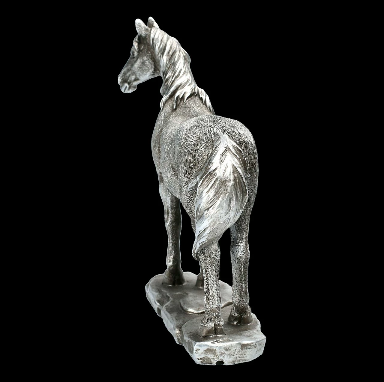 Diese edle Pferdefigur aus Kunststein (Polyresin) ist mit dem antiken Silber-Finish ein wunderbares Geschenk für alle Pferdefreunde und Pferdefreundinnen. Von den schön dargestellten Gesichtszügen, der Mähne und dem Schweif bis zu den fein herausgearbeiteten Haaren im Fell macht dieses Pferd überall eine gute Figur. Mit einer Höhe von 15,0 cm, einer Breite von 17,5 cm und einer Tiefe von 4,5 cm veredelt diese Silber farbene Pferdefigur jeden Tisch oder jedes Regal.