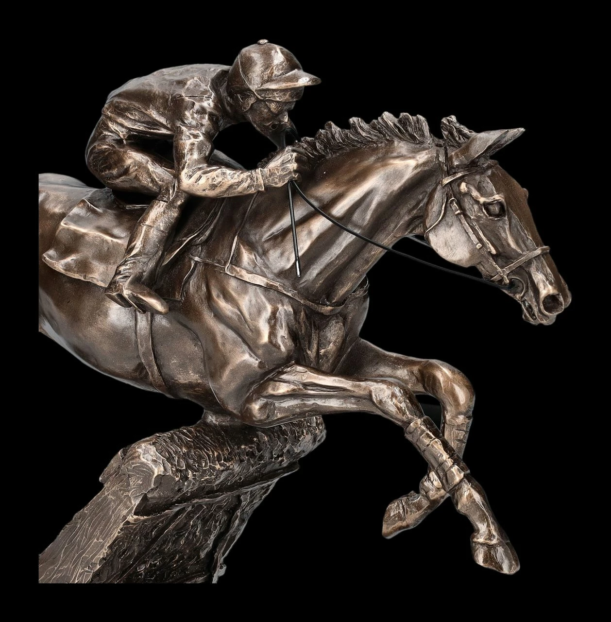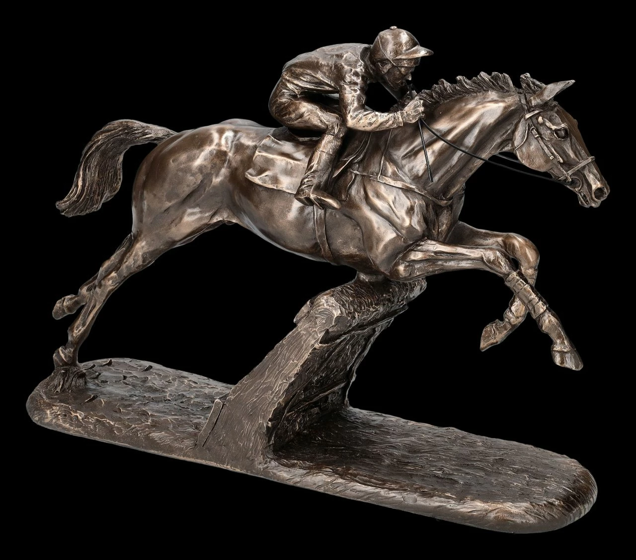 Eine wunderbare Skulptur der in England lebenden Künstlerin Harriet Glen ist diese Reiterfigur bei einem Hürden-Rennen. In der schwungvollen Bewegung und auch in der Haltung des Jockeys, der mit seinem Pferd beinahe verwachsen scheint, kommt die Kunst von Harriet Glen bei dieser kraftvollen Skulptur besonders gut zur Geltung. Schon früh hatte die Künstlerin mit kleinen Pferdeskulpturen begonnen und sie mittlerweile perfektioniert. Inzwischen lebt Harriet Glen in Dorset und kann da von ihrem Atelier aus auf Pferde und Wildtiere blicken. Davon inspiriert entstehen ihre fantastischen Skulpturen, die mittlerweile zu wahren Sammelobjekten geworden sind. Die elegante, 26 cm hohe, 34,5 cm breite und 10 cm tiefe Reiter-Figur beim Hürden Rennen wurde aus edel bronziertem Kunststein (Polyresin) gefertigt und ist eine wirklich herrliche Deko für das Sideboard oder den Schreibtisch. Die kraftvolle Figur ist aber auch ein perfektes Geschenk für Reiter und für Pferdefans. In unserem Shop gibt es weitere Arbeiten der berühmten Künstlerin Harriet Glen