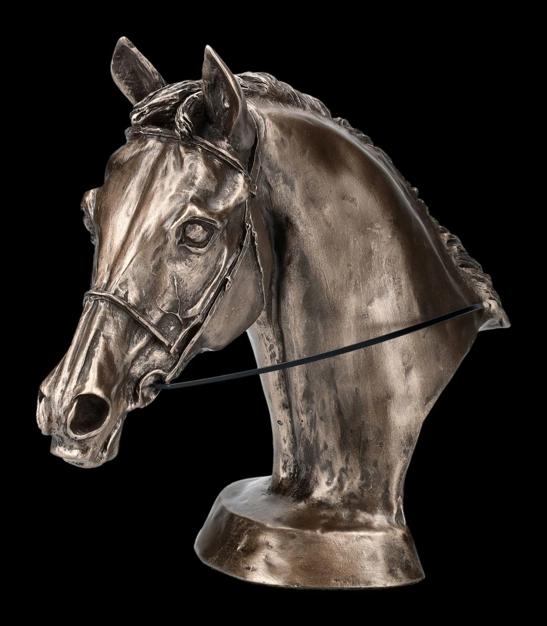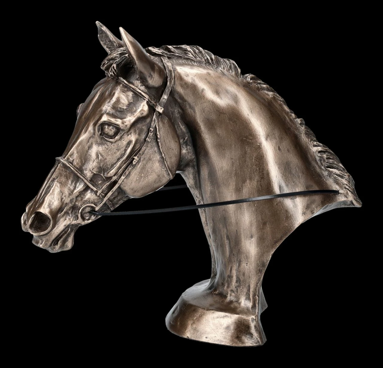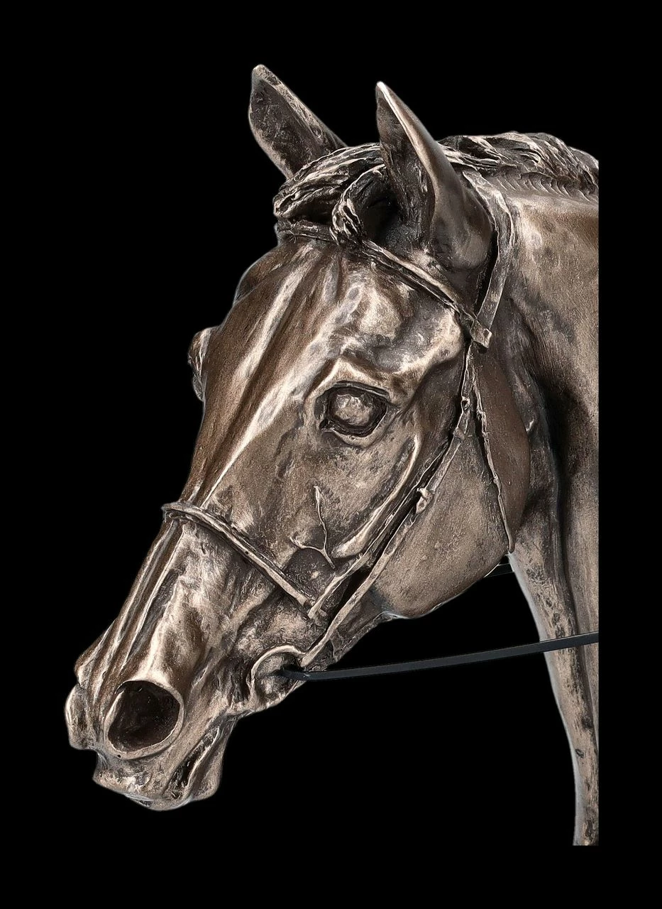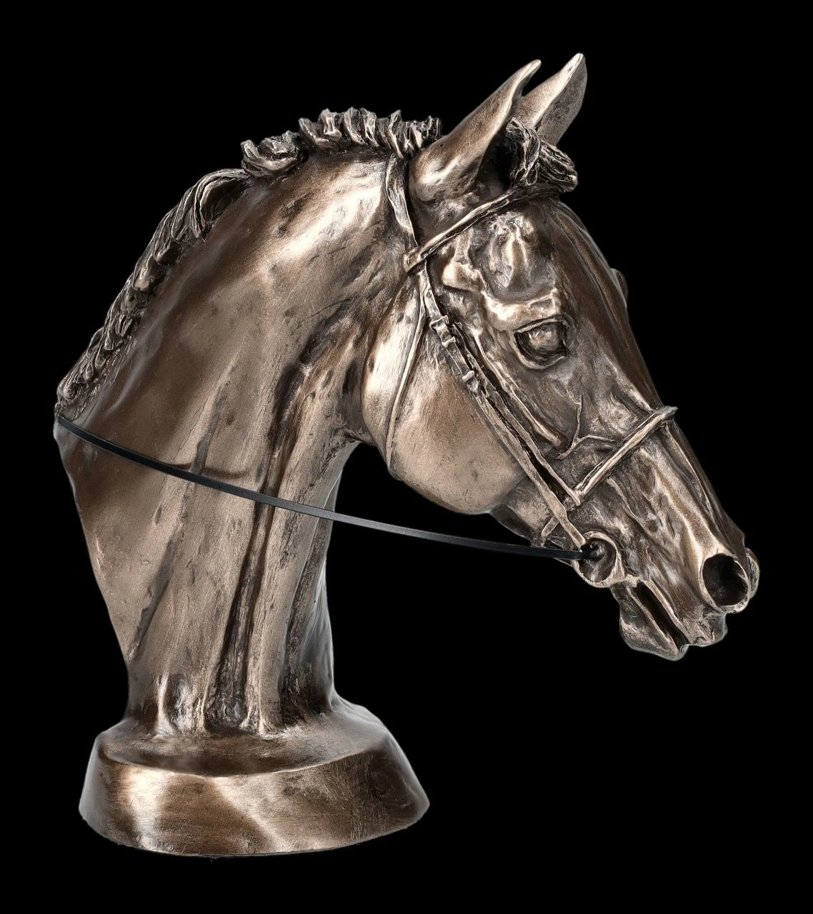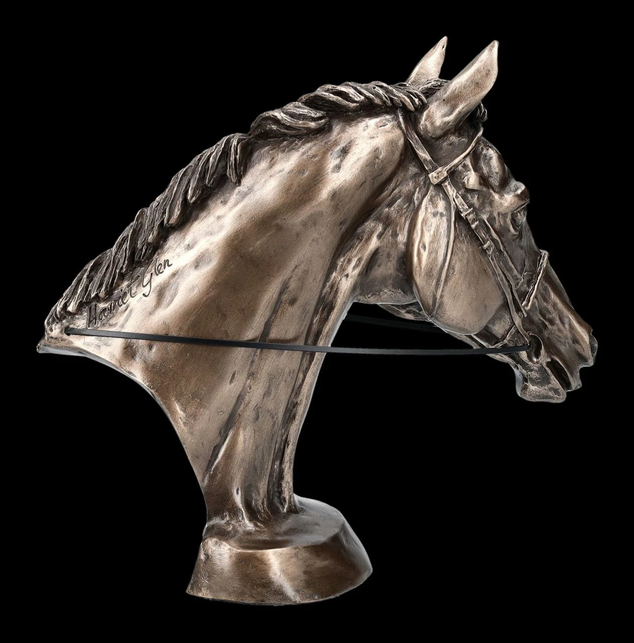 Die wunderbare Skulptur eines Pferdekopfes der in England lebenden australischen Künstlerin Harriet Glen ist ein fantastisches Geschenk für Pferdefans und vor allen auch für Vielseitigkeitsreiter. Vielseitigkeitspferde werden in allen drei Disziplinen Dressur, Springen und Gelände ausgebildet und müssen sich mutig allen Herausforderungen stellen. Das kommt bei dieser kraftvollen Skulptur besonders gut zur Geltung. Harriet Glen Schon hatte bereits sehr früh mit kleinen Pferdeskulpturen begonnen und sie mittlerweile perfektioniert. Inzwischen lebt die Künstlerin in Dorset, England und kann von ihrem Atelier aus auf Pferde und Wildtiere blicken. Davon inspiriert entstehen ihre fantastischen Skulpturen, die mittlerweile zu wahren Sammelobjekten geworden sind. Was bei dieser 15,5 cm hohen, 10 cm breiten und 16 cm tiefen Pferdekopf Büste aus edel bronziertem Kunststein (Polyresin) sofort verstanden wird. Die Pferdekopf Büste von Harriet Glen ist eine wirklich edle Deko. In unserem Shop gibt es weitere Arbeiten der berühmten Künstlerin
