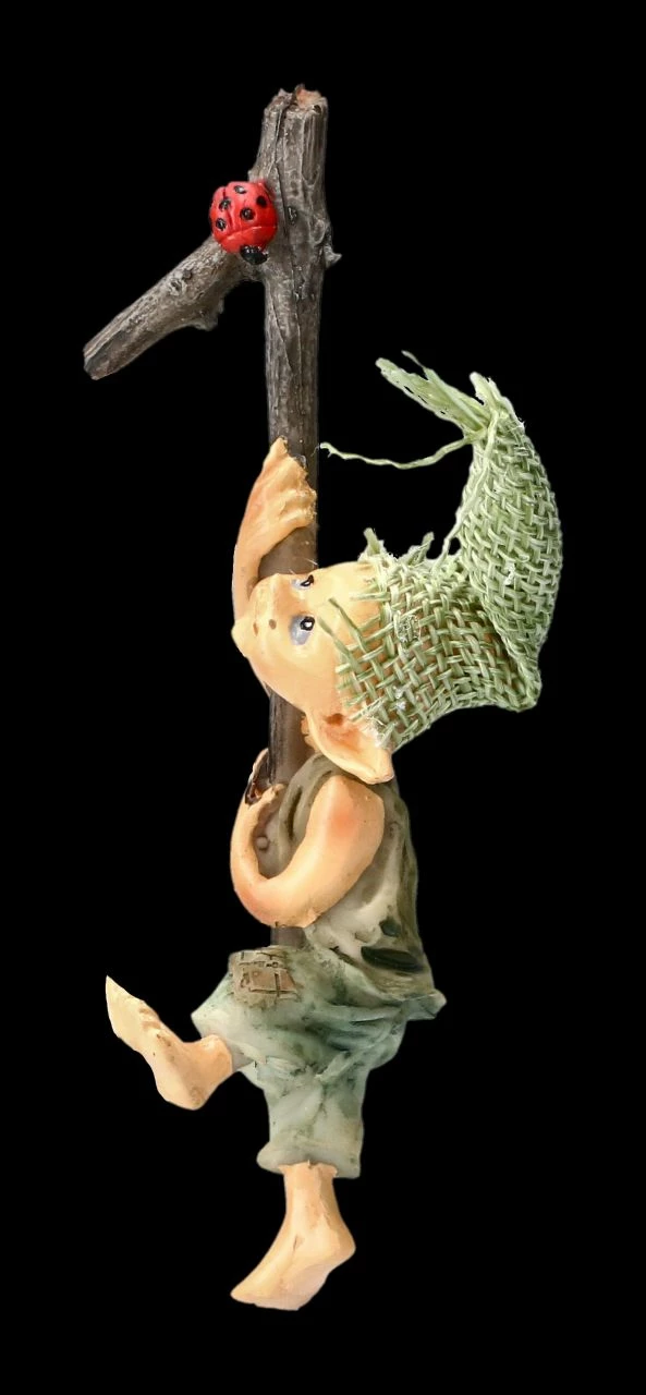 Der kleine Pixie Kobold klettert mutig an einem Ast hoch. Gleich hat er es geschafft! Wohin er wohl gerade unterwegs ist?